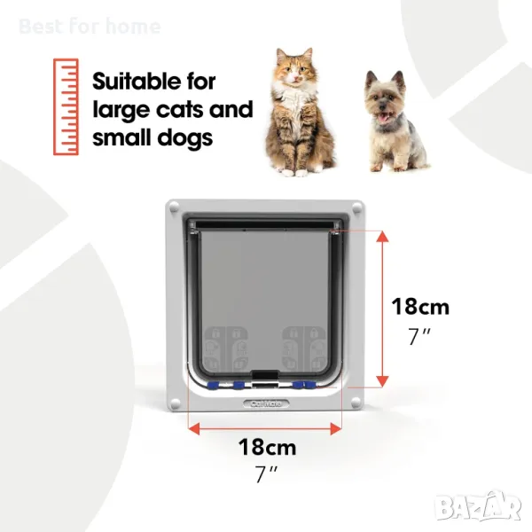 С размери на клапата от 7 инча на 7 инча, е идеален за големи котки и малки кучета. Неговият просторен дизайн побира домашни любимци с височина на раменете до 14 инча, осигурявайки лесен достъп за породи като йоркширски териери и миниатюрни пудели. Този размер гарантира, че вашите космати приятели могат да влизат и излизат удобно.