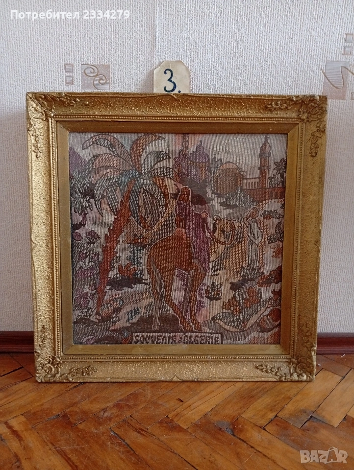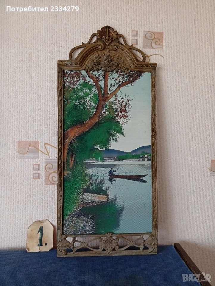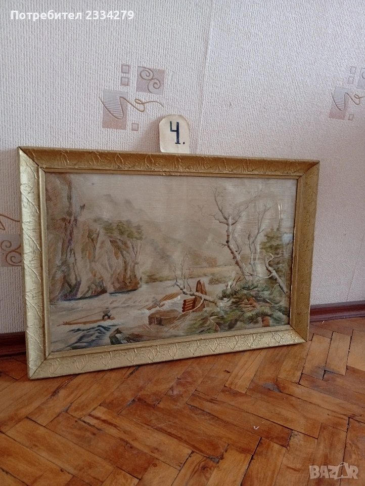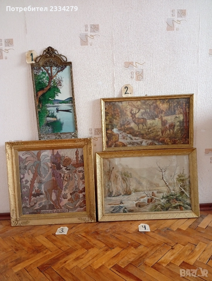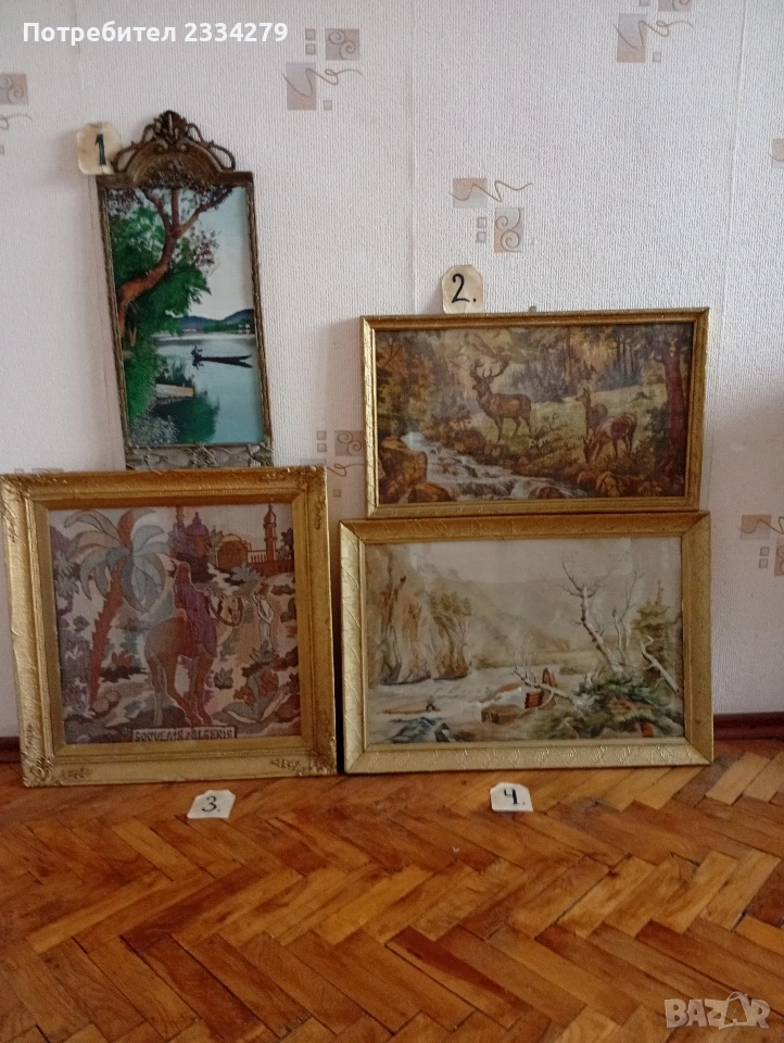 N:1 стара японски копринен машинен гоблен от 60-те години, поставен в масивна бронзова рамка с размери 60х26см., цена 40€.; N:2 тъкана картина тип гоблен изобразяваща ,, Горски пейзаж" поставен в дървена орнаментирана остъклена рамка, размери 60х37см., цена 10€.; N:3 стар Алжирски гоблен, машиннотъкано Коломбо пано поставен в красива барокова остъклена дървена орнаметирана рамка с размери: 56х56см., изработен през 50-те години на миналият век, цена 30€.; N:4 ръчно изработен гоблен пано изобразяващ ,,Речен пейзаж" изработен през 60-70години, поставен в орнаментирана дървена остъклена рамка с размер 64х47см., цена 20€.