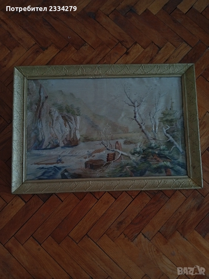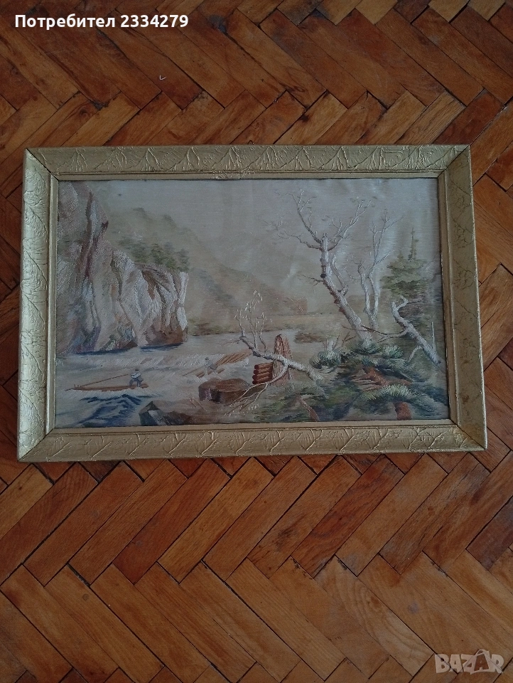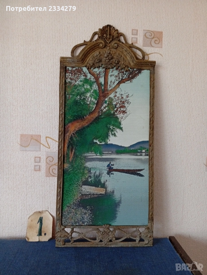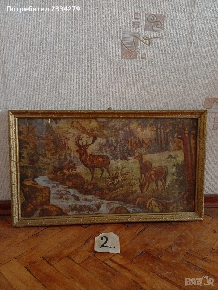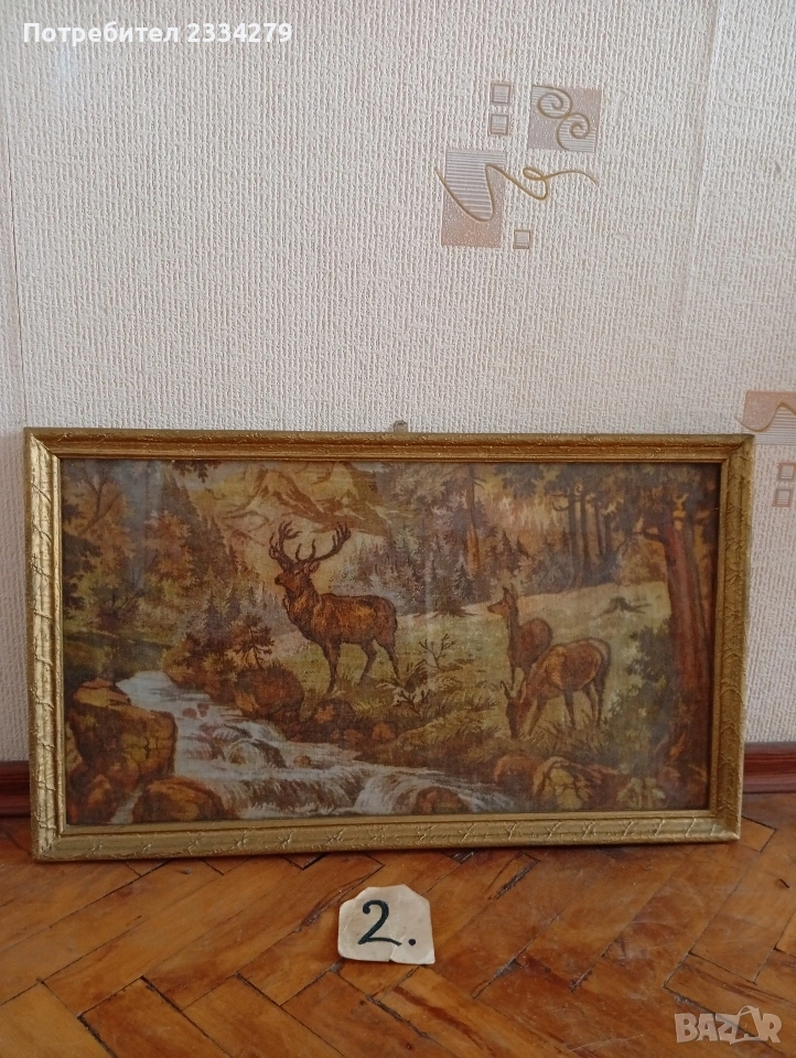 N:1 стара японски копринен машинен гоблен от 60-те години, поставен в масивна бронзова рамка с размери 60х26см., цена 40€.; N:2 тъкана картина тип гоблен изобразяваща ,, Горски пейзаж" поставен в дървена орнаментирана остъклена рамка, размери 60х37см., цена 10€.; N:3 стар Алжирски гоблен, машиннотъкано Коломбо пано поставен в красива барокова остъклена дървена орнаметирана рамка с размери: 56х56см., изработен през 50-те години на миналият век, цена 30€.; N:4 ръчно изработен гоблен пано изобразяващ ,,Речен пейзаж" изработен през 60-70години, поставен в орнаментирана дървена остъклена рамка с размер 64х47см., цена 20€.
