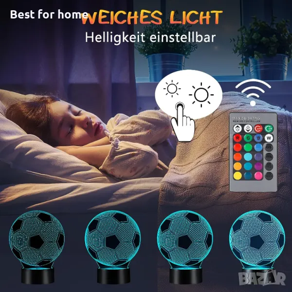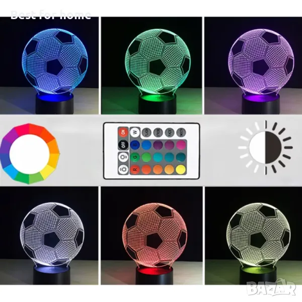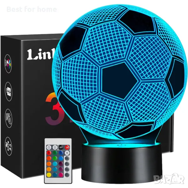 Футболна 3D LED нощна лампа: Ще получите футболен образ с тази нощна лампа, която използва технология за 3D осветление, за да проектира изображение върху акрилна плоча, прикрепена към основата. В допълнение към показването на една футболна топка наведнъж, можете също да избирате от 16 цвята с помощта на дистанционно управление, което ви позволява да затъмнявате или осветявате изображението. Работи с три АА батерии (не са включени), но можете да го захраните и с USB кабела в комплекта.