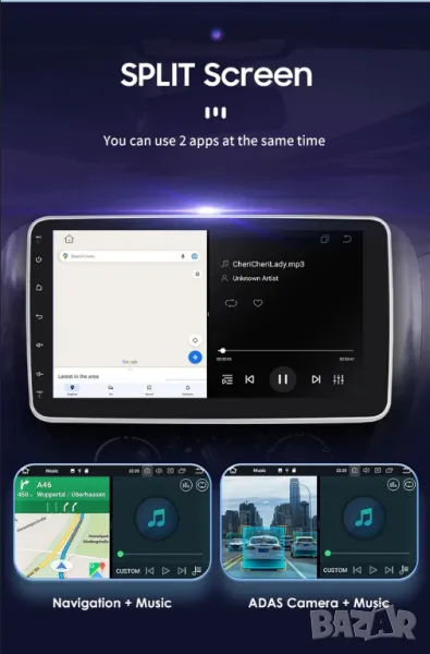 9. Автоматичен обратен изглед за паркиране : Когато колата е на задна предавка, дисплеят автоматично ще премине към изглед на камера за обратно виждане. Възможен е и монтаж на предна камера - след изключване от задна предавка, екранът автоматично ще превключи към изглед предна камера за 10 секунди. Камери се поръчват отделно.