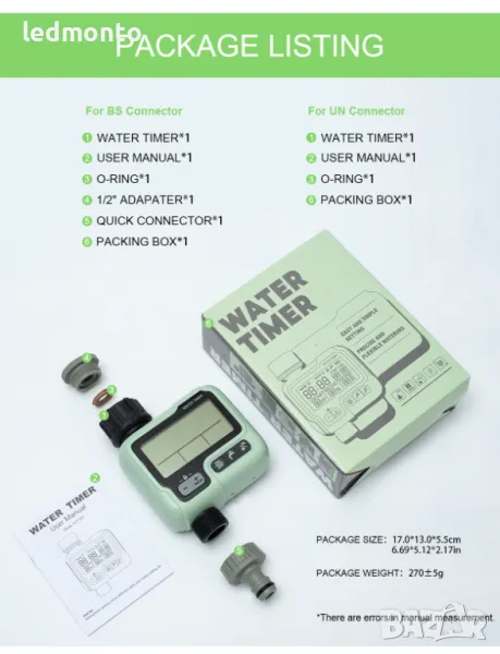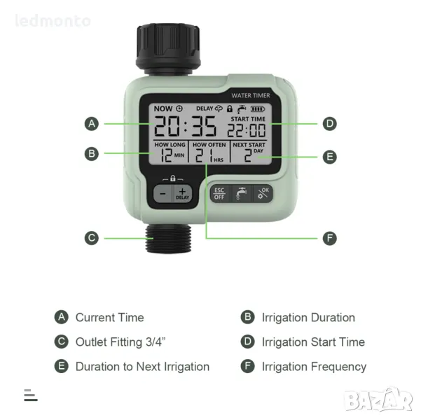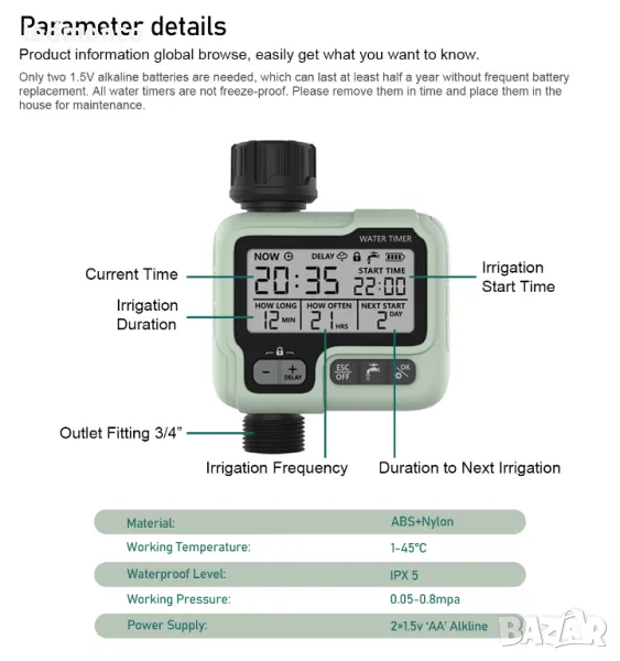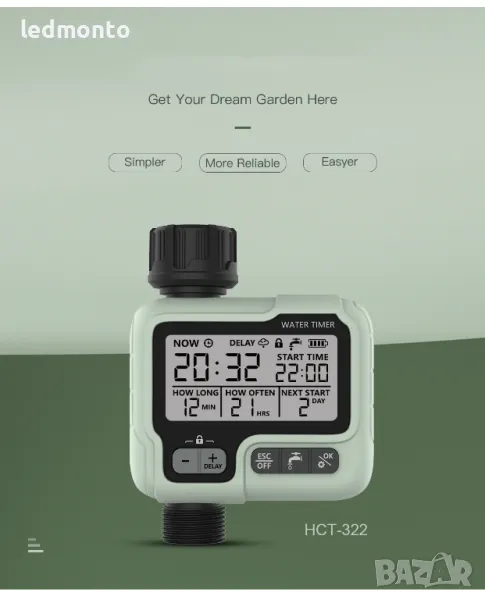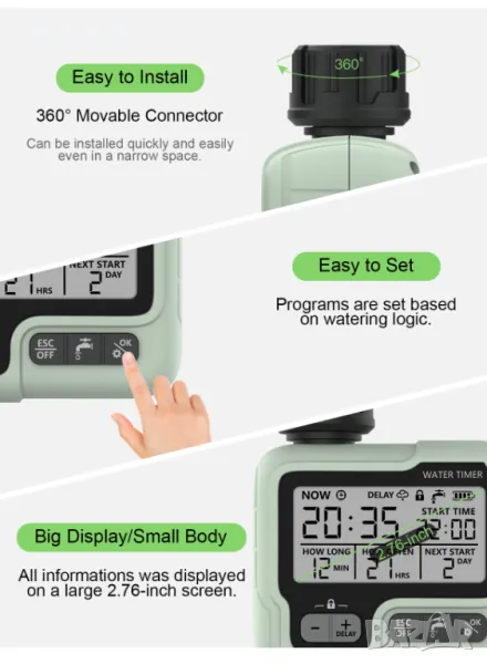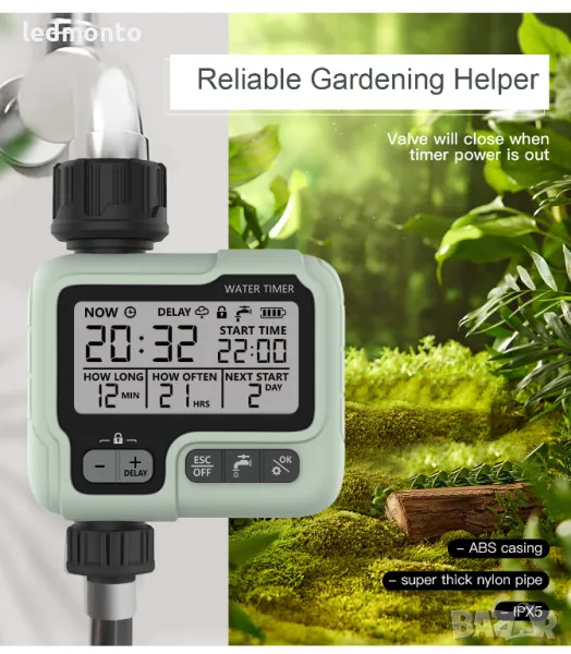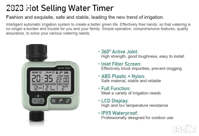 - **Ефективно управление на водата**: Таймерът осигурява прецизни графици за поливане, спестявайки ресурси.