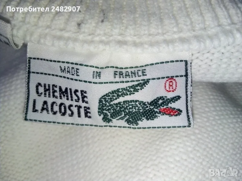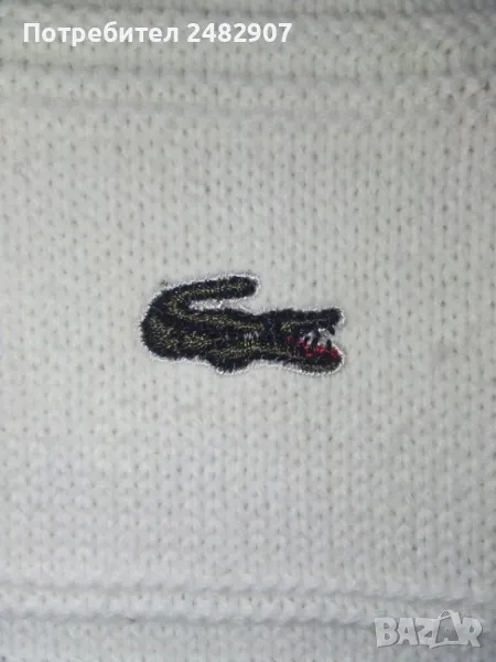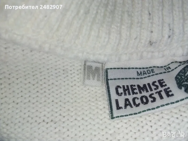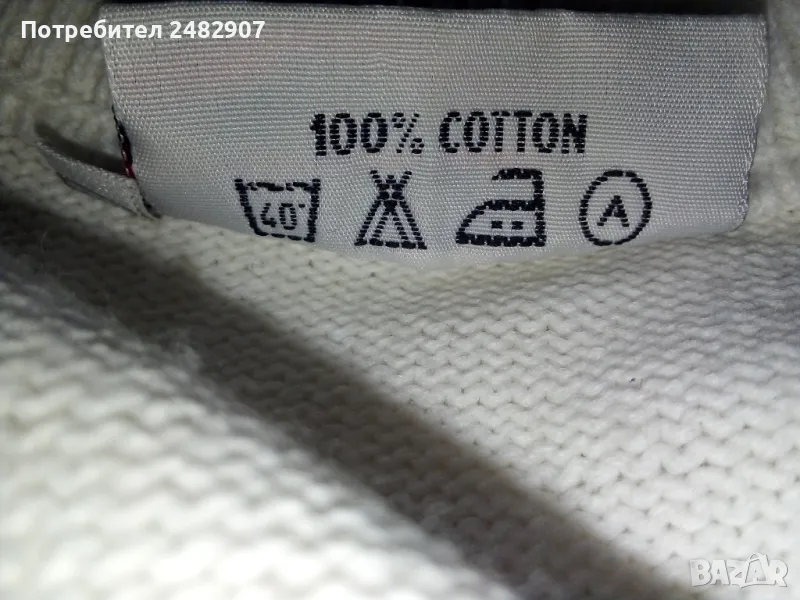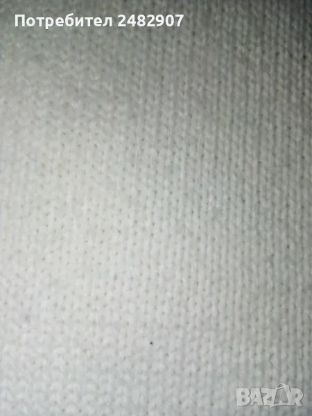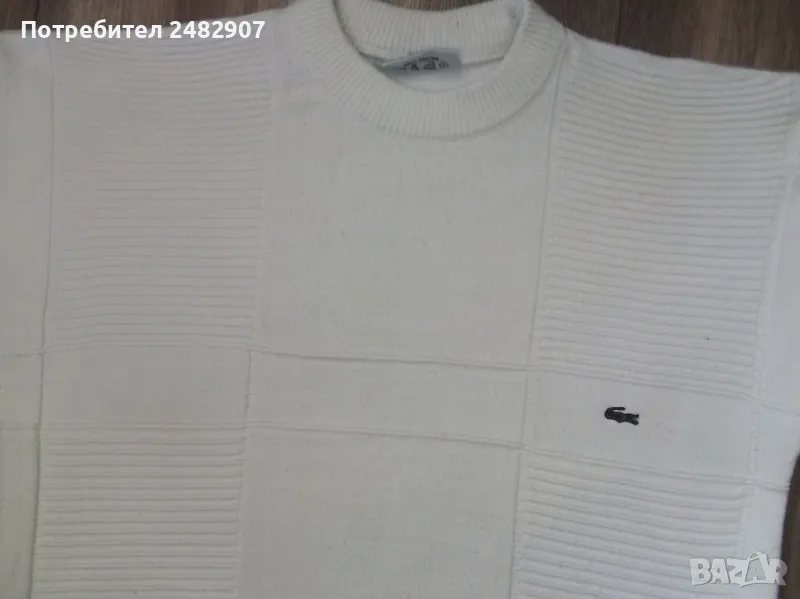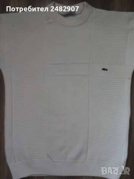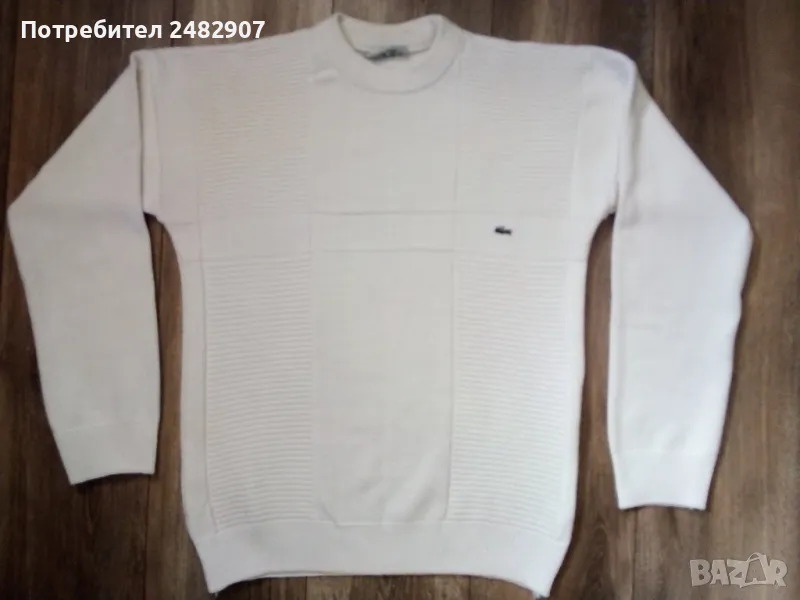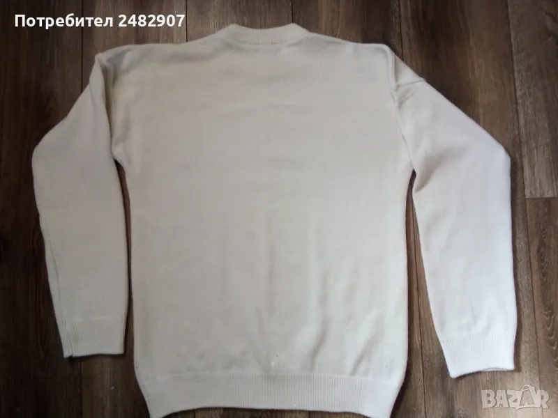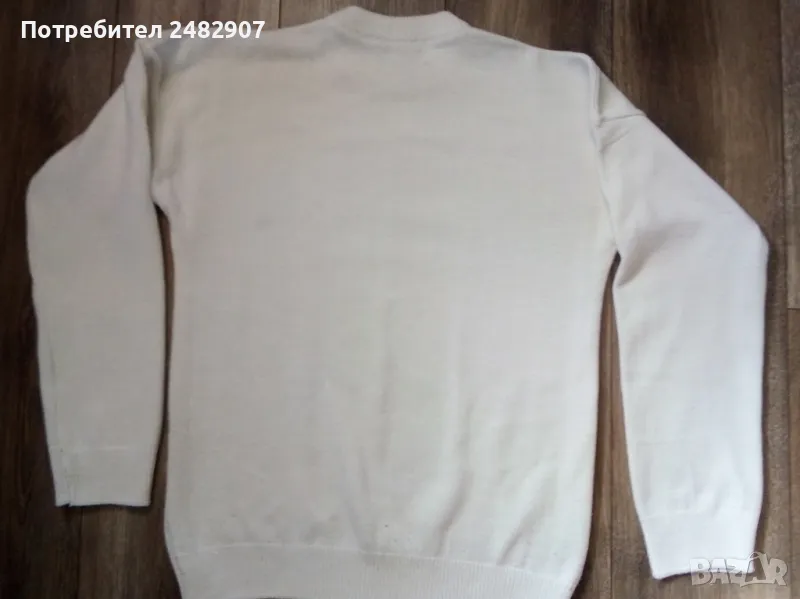Мъжки машинно плетен пуловер в бяло, размер М. Съдържа 100 % памук. Ширина в раменете - 60 см, ширина под мишниците - 55 см, ширина в долната част - 43 см, дължина от рамото до долу - 66 см, дължина на ръкава от рамото - 54 см, ширина на ръкава в долната част - 11 см. Запазен, с нормални следи от износване.