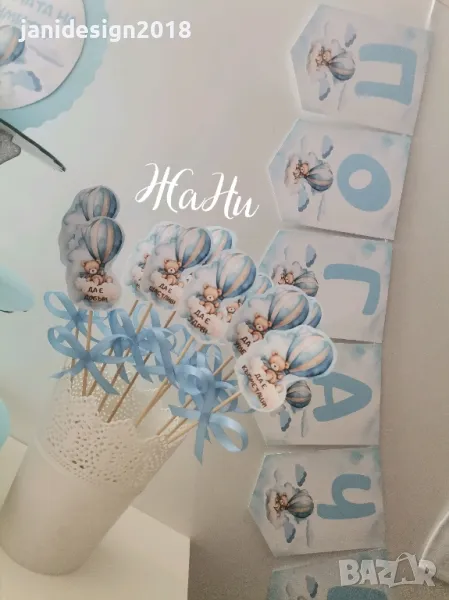 Украса За бебешка погачаВсеки клиент сам избира какви аксесоари желае да включва украсата, както и нужната бройка. За повече информация Ви очакваме на лично съобщение. * надпис* Месал за разчупване на питката с името на детето и датата* малка кърпичка за паричките с име *боди с име и дизайн съобразен с темата на празника *бонбони с дизайн съобразен с темата на празника * рамка А4 формат с бебешка визитка или надпис по избор*книга за пожелания с химикал * карти за пожеланията на орисниците * топки и цветя от тишу за украса * чаши, чинийки, вилички и сламки* покривка за маса * Салфетки боди/рокля/риза/едноцветни с декорация по темата * топери с пожелания за орисане на бебе кръгли или във форма на животни, със снимка на детето или с надпис по поръчка за украса или подаръчета за гостите *Украса За маса * стойка, формички и топери за мъфини*табела количка или бебешко шише * Покани * подаръчета за гостите