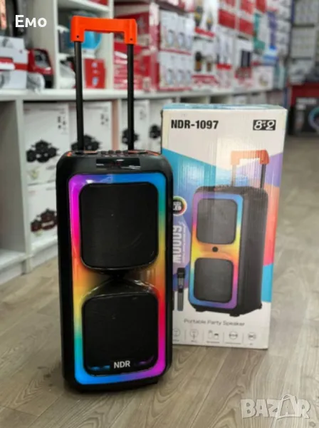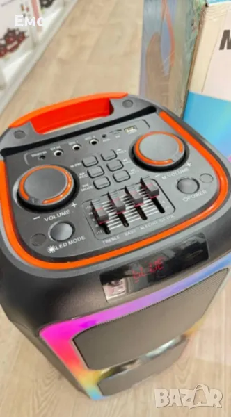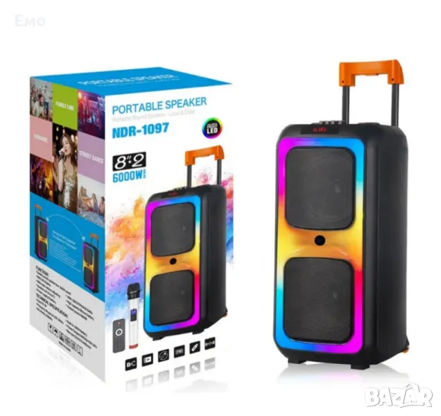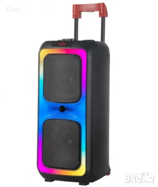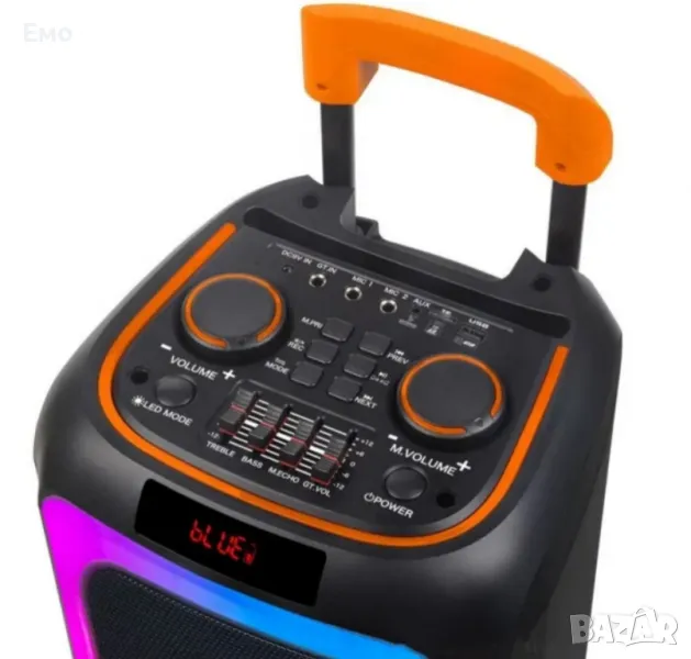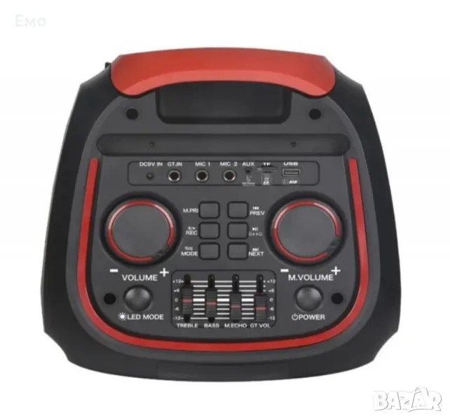 1.Материал: Пластмаса 2. Мощност: 40W+EQ3. Високоговорител: 2 X 8” високоговорител4. Батерия7.4V/4500MAH литиева батерия5.Функция: USB,TF,Bluetooth(5.0),FM.TWS 6.Горно управление. Главен обем+Ехо+Микрофон. Сила на звука, Aux вход, вход за микрофон, LED светлина 7.Аксесоар: Adaptet Дистанционно управлениеТунер: FM2 входа за микрофон,LED парти светлиниБезжичен микрофон-1
