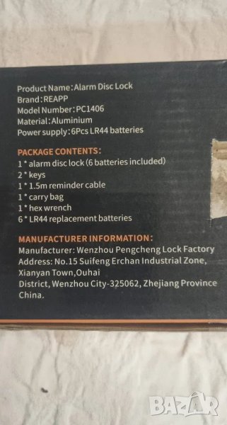 Алармата за заключване на спирачен диск REAPP за защита от кражба на мотоциклети и велосипеди на закрито и на открито. Оборудван е с вграден чувствителен сензор, след като бъде засечена вибрация или движение, той излъчва непрекъсната аларма от 110 dB, за да спре всички крадци, които се опитват да преместят вашите превозни средства или да разбият ключалката. Ключалката е оборудвана с цилиндър за заключване от алуминиева сплав и меден ключ, което прави отключването много по-лесно от обичайния ключ с кръгла дупка от други марки. Корпусът на бравата е здрав, добре уплътнен и издържа на различни по сила удари. Не е нужно да се притеснявате, когато го използвате при дъждовно или екстремно време. Ключалката се заключава чрез просто натискане надолу, след 3 секунди ще чуете звуков сигнал „Di“, което означава, че ще влезе в режим на аларма. В комплект с въже за напомняне, което ви напомня да отключите ключалката преди шофиране. Алармата REAPP е подходяща за всички видове превозни средства, оборудвани със спирачни дискове. Могат да се използва за повечето мотоциклети, велосипеди. Ключалката на спирачния диск REAPP включва допълнителен комплект резервни батерии. Батерията е издръжлива и лесна за смяна, ако алармата е задействана 10 пъти на ден, батерията може да работи около 6 месеца. Когато устройството издаде звуков сигнал „......“, батерията е празна и трябва да я смените.