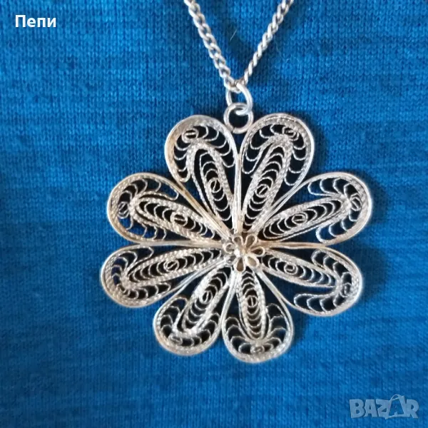 Изящен медальон, изработен с техника филигран. Дължина на верижката 64 см, диаметър на цветето 5 см. Материалът не е сребро. Може би е посребрен.