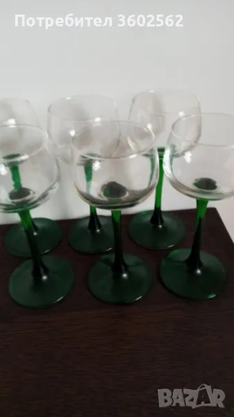 Сервиз от 6 броя винтидж френски чаши за бяло вино на марката луминарк. По 120 мл. на високо зелено столче. Височина на чашата16 см. ширина 6см. чашите са от 70те години.На всяко столче има маркировка France.Комплекта е в перфектно състояние.