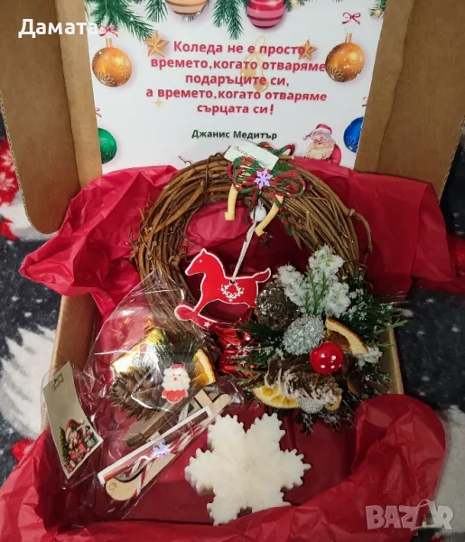 Подаръчни Коледни кутии, които включват- малък венец(13 см ), ароматна свещ снежинка, топка за елха/коледна играчка за елха, коледно късметче и др.Може да се направят изцяло по ваше желание.
