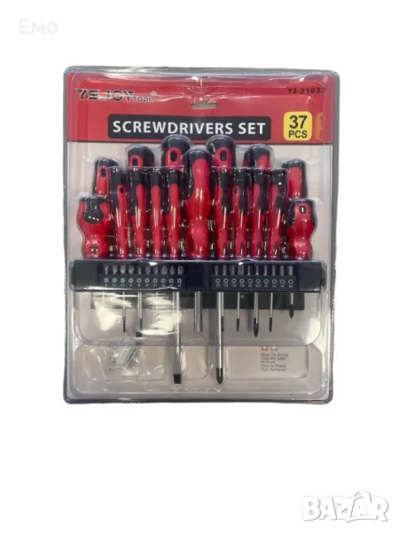 Брой части: 37; Материал: Хром-ванадиева стомана (CrV); Допълнителни характеристики: Магнитни върхове, ергономични дръжки, въртящи се глави на прецизните отвертки, специална тава за битове; Компактност и организация: Лесно сглобяване на закачалка с 4 отвора за монтаж; Тип отвертки: 8 x плоски и Phillips отвертки: 6x38 мм, 5x75 мм, 6x100 мм, 8x150 мм, PH2x38 мм, PH1x75 мм, PH2x100 мм, PH3x150 мм / 8 x прецизни отвертки: 2.0x50 мм, 2.5x50 мм, 3.0x50 мм, T9.50 мм, PH00x50 мм, PH0x50 мм, PH1x50 мм, T10x50 мм; Битове: 20 x 25 мм накрайници: 3-4-5-6-7 мм, PH0- PH1 -PH2 -PH3, T10, T15, T20, T25, T27, T30, T40, PZ-, PZ1- PZ2 -PZ3п; Битова отвертка: 1 бр.