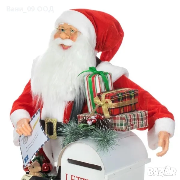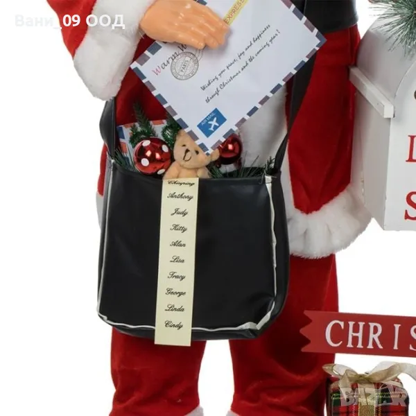 Уникална реалистична фигура Дядо Коледа с пощальонска торба, пълна с писма и подаръци! Той е поставен на дървена основа и има страхотна дървена пощенска кутия с етикет. Има музика и led осветление, като можете да избирате между 3 режима: само светлина, светлина и музика и само музика. Работи с 3 батерии АА (включени в комплекта).