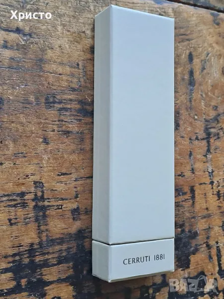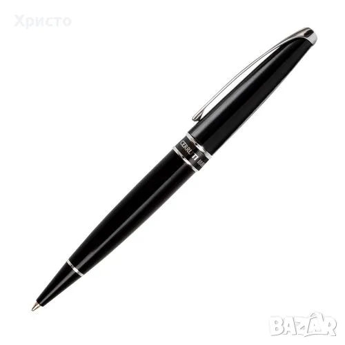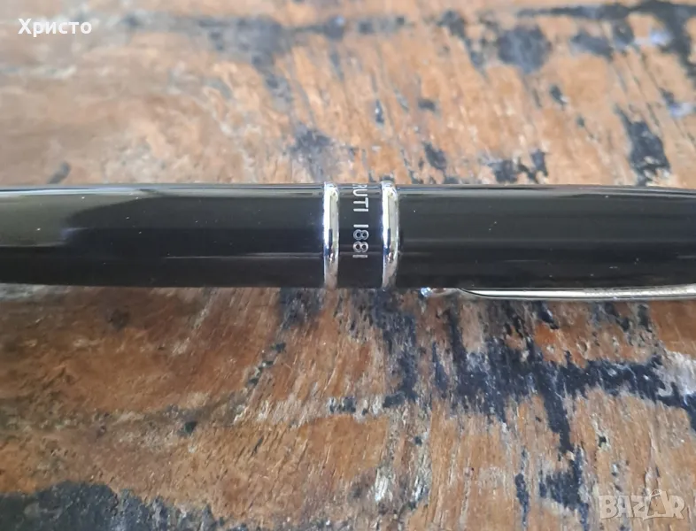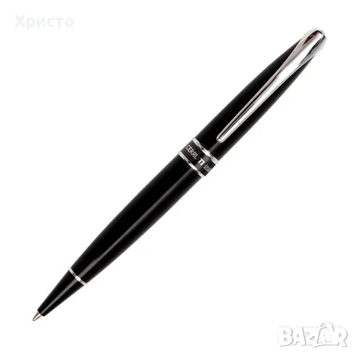 Продавам химикалка Черути CERRUTI 1881, метална, масивна и надеждна, сребристи части и висококачествен черен лак, приятно закръглена форма, включва се със завъртане. Сертификат за произход и елегантна подаръчна кутия. Пише със син метален пълнител тип Parker. Чисто нова, недокосвана, внос преди един месец от Холандия. Имам 2 броя.