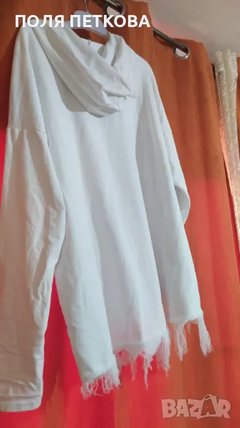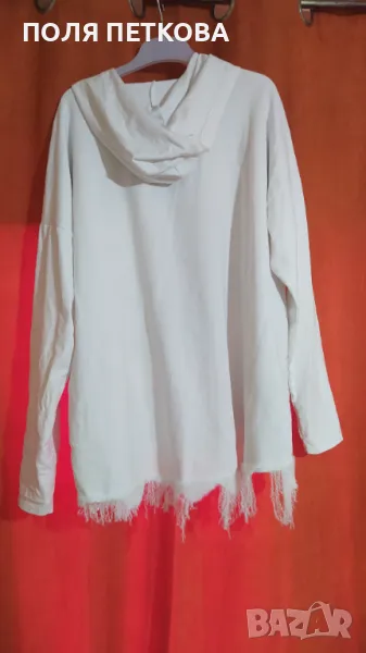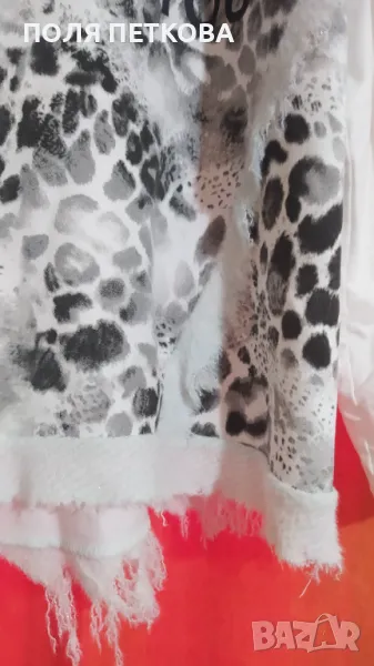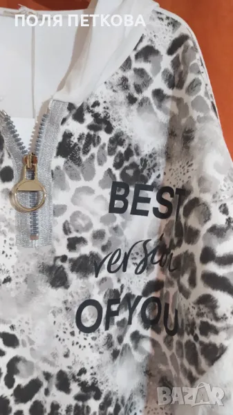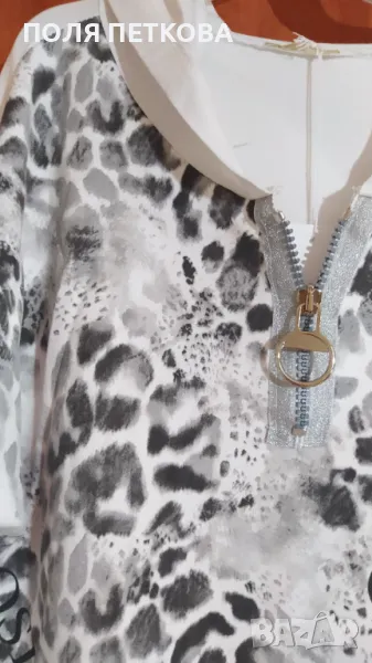 Нова ефектна зимна блуза изключително мека памучна материя и много еластична с ефектен леопардов принт отпред и лек металик ефект само отдолу с цип отпред на деколтето който може да се разкопчава по ваш избор с качулка става за размер от L до два пъти XL гръдна до 130 с еластичност дължина отпред 62 см отзад 70 см
