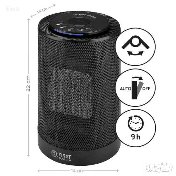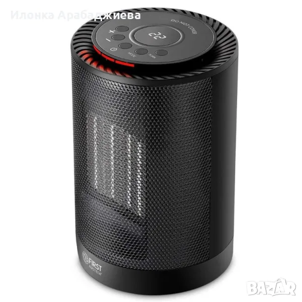Керамичната печка FIRST е съчетание от сила, ефективност и съвременен дизайн, предоставяйки необходимото отопление и удобство във вашия дом или офис. С нейните многофункционални възможности и ниско ниво на шум, тя е перфектният избор за зимния сезон и осигуряваща уют и топлина във всяко помещение.Мощност: 1200W; Нагревателна Система: Керамика / PTC; Нива на Отопление: 2 (600W / 1200W); Регулируема Степен на Нагряване. Ниво на Скорост: 1 Материал на Корпуса: Пластмаса. Защитно Покритие: Решетка. Температурен Дисплей; Таймер. Превключвател за Преобръщане. Ниво на Шум: 49 dB. Цвят: Черен. Основно Напрежение: 220-240V Размери: Ш: 14 см x В: 22 см x Д: 14 см. Тегло: 1.1 кг. Дължина на Кабела: 140 см.
