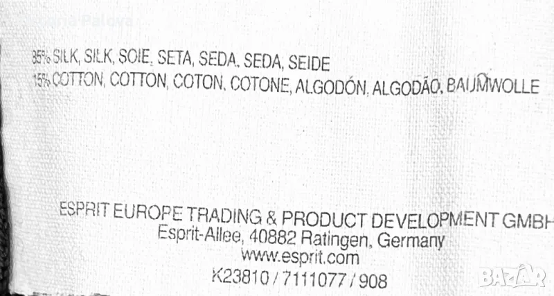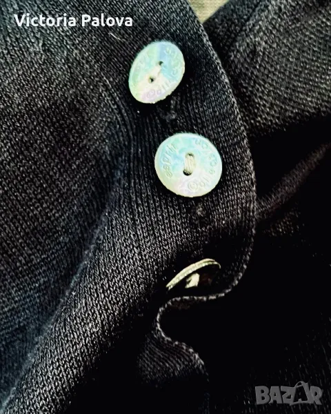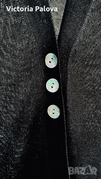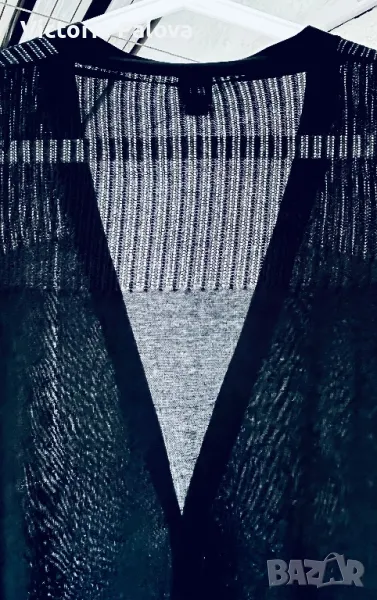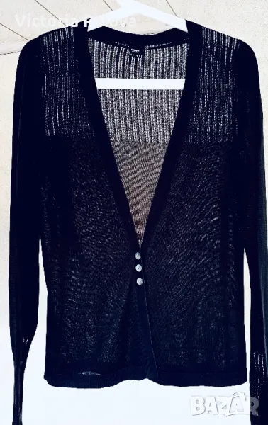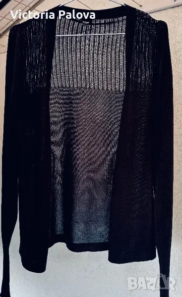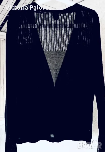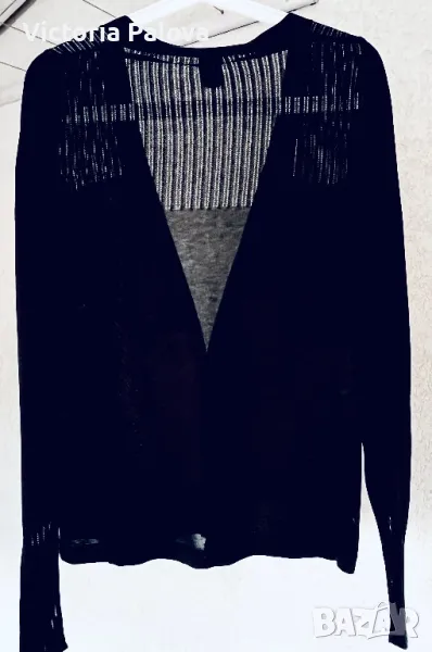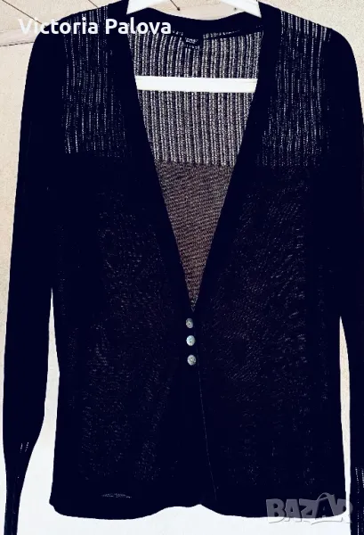 Неизползвана нежна жилетка коприна 85% и памук 15%, горната част на гърба и маншетите са прозрачни ( ажурни) , отпред е с три перлени брандирани копчета от натурален седеф. Рамо - 38см, ГО - 48см, дължина - 65см, ръкав - 55см плюс маншет - 18см. Има малко разтегливост.