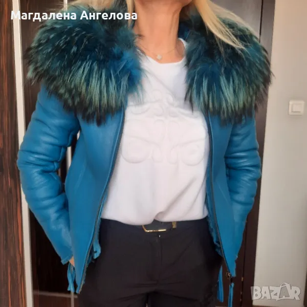 Късо синьо яке естествена кожа с яка естествен косъм → Обява 47745415