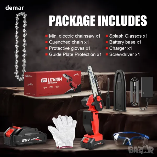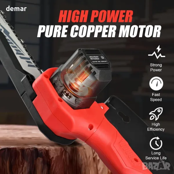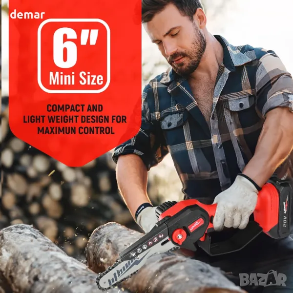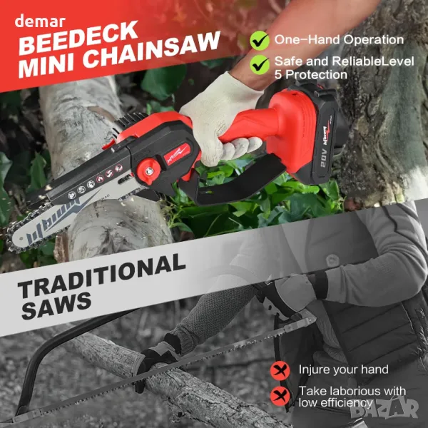 Този мини акумулаторен верижен трион разполага с технология за остър чип и висококачествен мотор от чиста мед за ефективно рязане, постигайки скорост на веригата от 19,2 фута/сек за рязане на 6" клони само за 8 секунди. Захранва се от 20V 2000mAh литиева батерия, която зарежда за около 2 часа и осигурява до 30 минути време на работа. Подобрените мерки за безопасност включват превключвател за защита от пръски и пет вида защита срещу проблеми с претоварване, ниско напрежение, късо съединение и температура идеален за различни задачи като рязане на дърва, кастрене на клони и градинарство, което го прави универсален инструмент за всеки любител на Направи си сам или градинар.