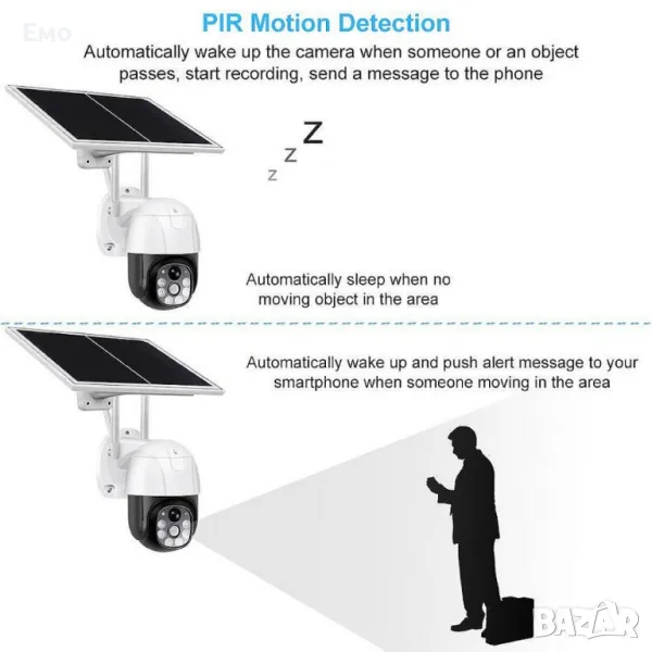 Резолюция: 5MP сензор, Full HD 1080P качество на изображението; Нощно Виждане: Инфрачервена LED технология с обсег до 20 метра; Соларно Захранване: Вграден соларен панел за автономно захранване; Свързаност: Wi-Fi (802.11/b/g) и 4G SIM карта за дистанционно наблюдение и управление; Двупосочно Аудио: Вграден микрофон и говорител за двустранна комуникация; Детектор за Движение: Изпраща известия и записва видео при засичане на движение; Съхранение: Поддръжка на microSD карти до 64GB; Водоустойчивост: IP66 защита, подходяща за външен монтаж.