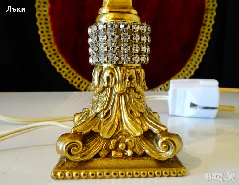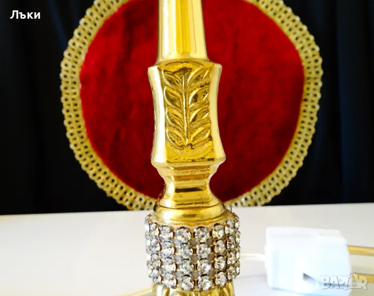 дебела позлата.Декорирана с ефектен бароков релеф и блестящи кристали Сваровски.Лампата работи.Височина без крушката 27.5 см.,основа 6 х 6 см.,тегло 750 гр.