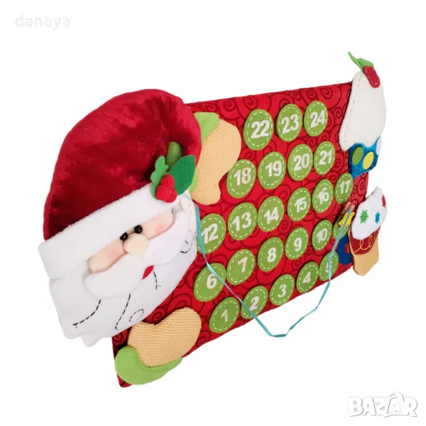 Подгответе дома си за празниците с този очарователен коледен календар, идеален за украса и създаване на вълнуващо очакване преди Коледа! Календарът е изработен от висококачествен текстил, с ярки и детайлни 3D декорации, включително закачлив Дядо Коледа, който наднича, и коледни сладки за още по-празнично усещане. Основата на календара е с размер 47×31 см, а с добавените декорации достига до 62×37 см, което го прави впечатляващ акцент във всяка стая.