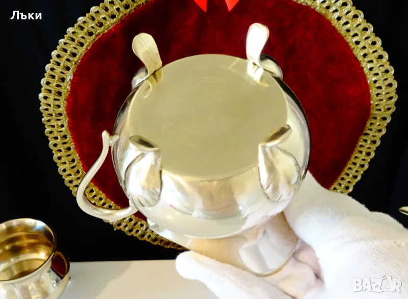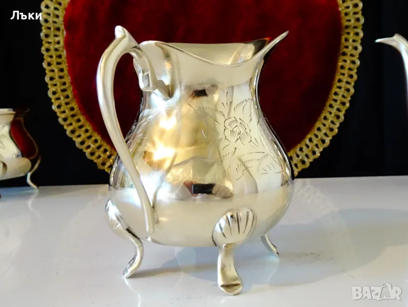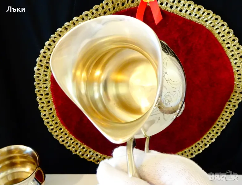 Старинна английска кана за ракия,каничка,латиера,майсторска ръчна изработка от масивен бронз с високо качество,кристална гладкост и златен блясък.Декорирана с релефно гравирани барокови орнаменти.Стои стабилно на четири релефни крачета.От вътре е в перфектно състояние,сякаш не е