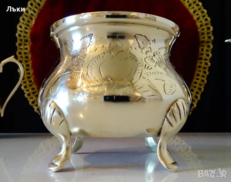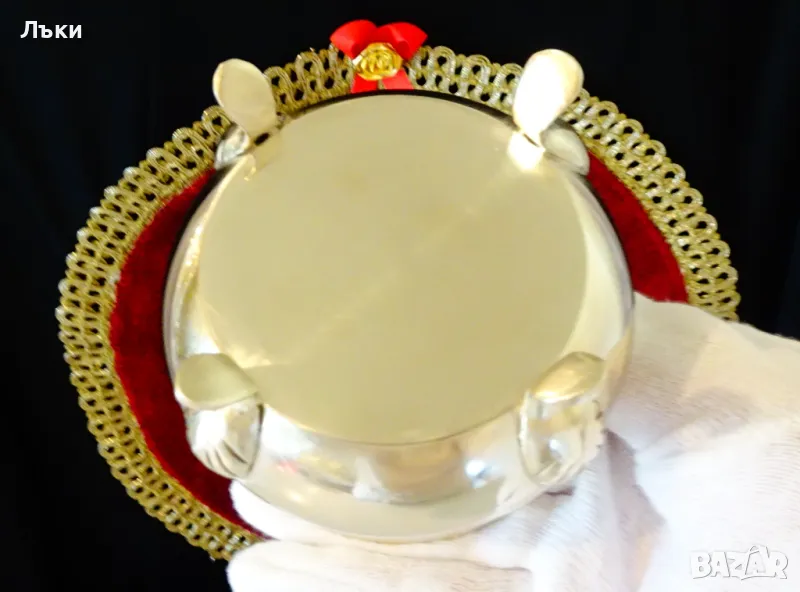 масивен бронз с високо качество,кристална гладкост и златен блясък.Декорирана с релефно гравирани барокови орнаменти.Стои стабилно на четири релефни крачета.От