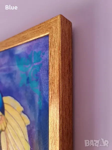 Приложена е техниката Батик, при която се използват бои за текстил или коприна, контурни маркери и восък. Платното е опънато върху дървена подрамка и завършено с елегантна, декоративна дървена рамка в златни и медни цветове. Преобладаващите цветове в картината са в златно и различни нюанси на лилаво.