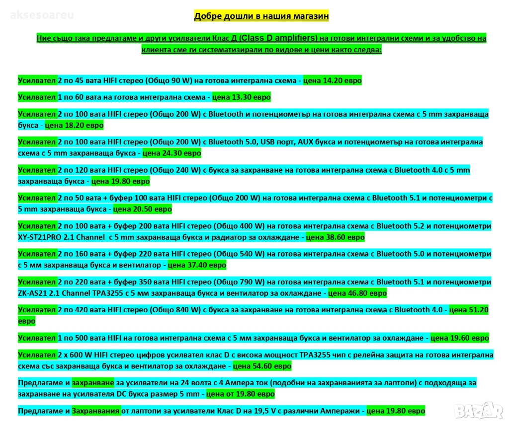 и 1 по 500 вата на готови интегрални схеми), захранване за усилватели