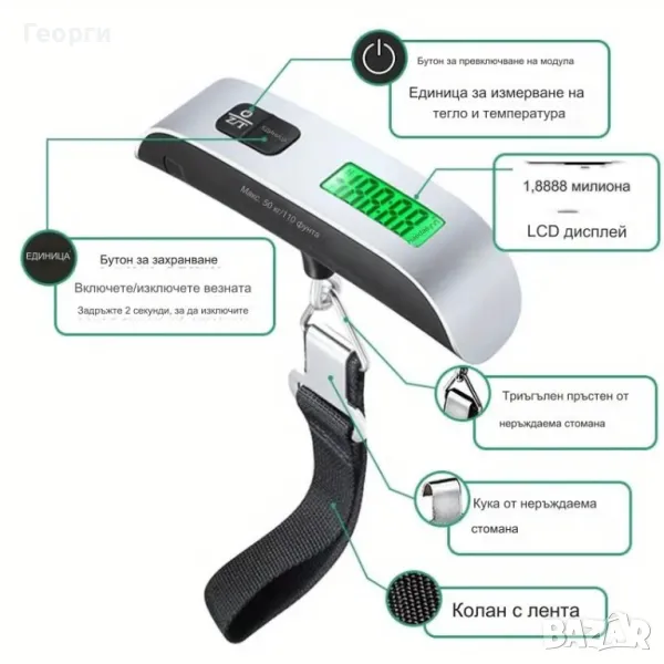 - Преносим Инструмент за Измерване на Тегло на Куфар и Багаж, Капацитет до 49.9KG