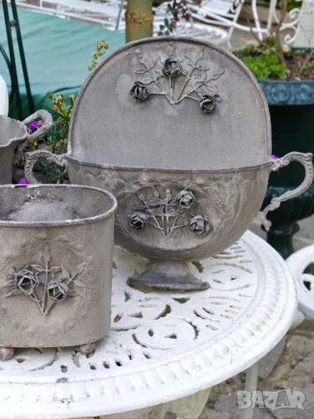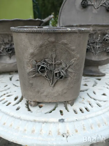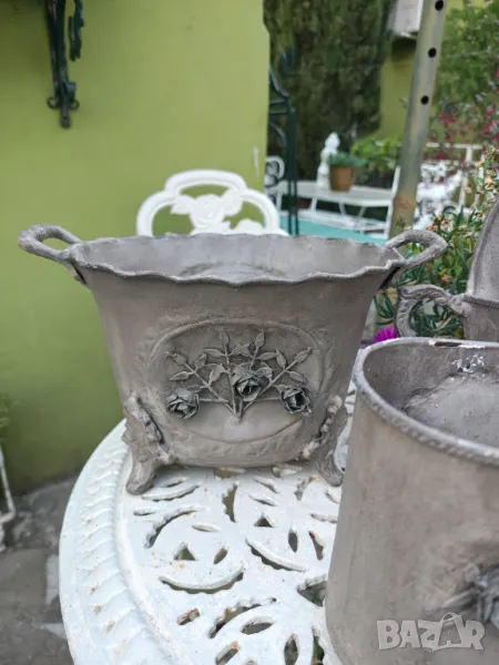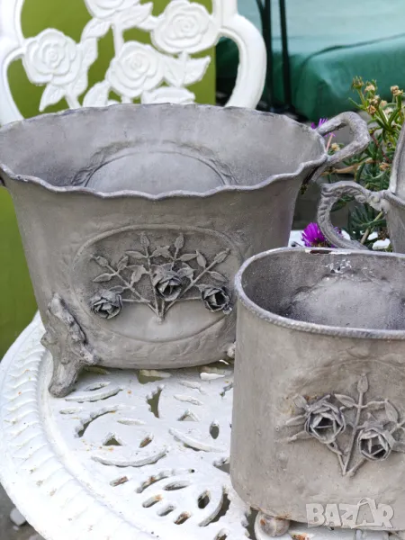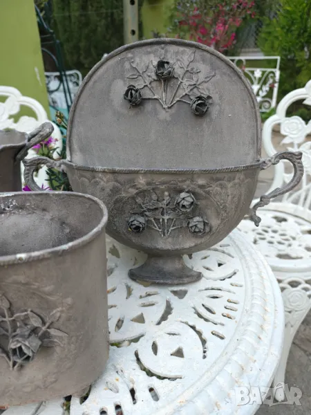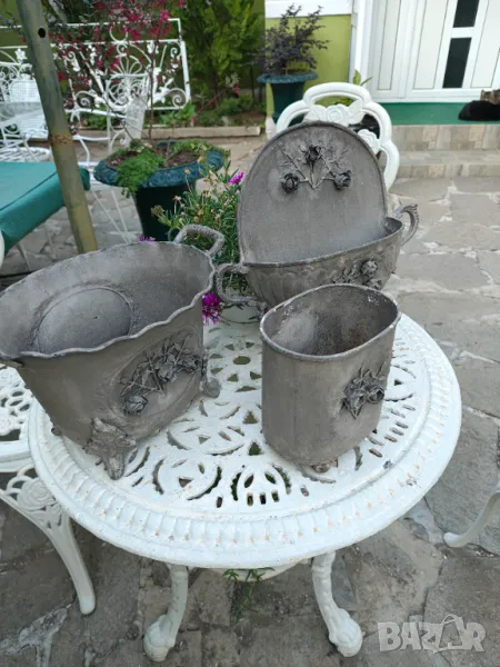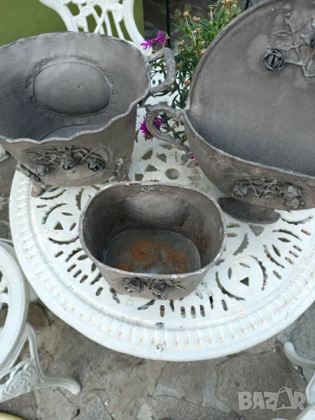 Изключителен лот с антикварна стойност ,ръчно изработени от желязо .Една закачаща се на стена с размер 34 на 34 см дълбока 14 см .Средна за земя вис 18 см широка 30 см с дръжките .Малка за маса 16 на 15 см ( само при нея се виждат на дъното от времето ръжда въпреки че никога не са ползвани .ЦЕНАТА Е ЗА ЛОТА НЕ СЕ ПРОДАВАТ ОТДЕЛНО .