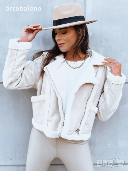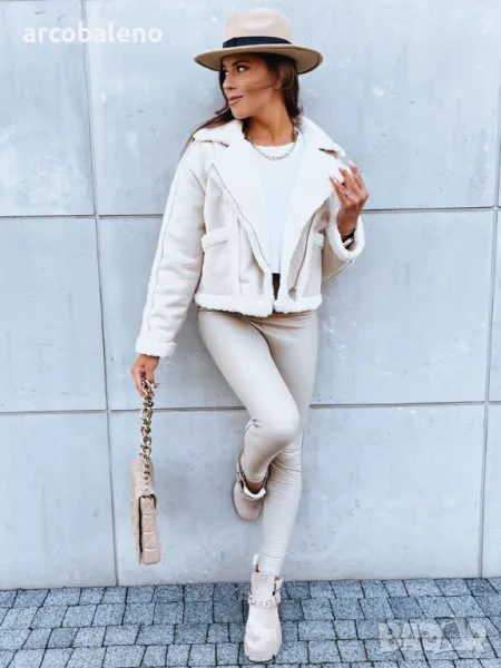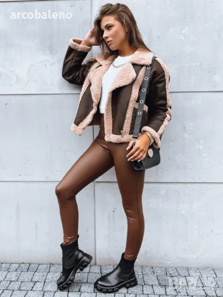 Късо яке от имитация на кожа е идеално предложение за предстоящия сезон. То е изолирано отвътре с овча кожа, също и на яката и като декоративен елемент от външната страна на якето. Закопчава се с цип и има два джоба. Тя ще бъде идеалното допълнение към вашия есенен стайлинг.