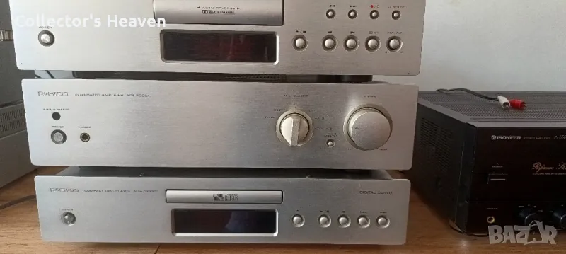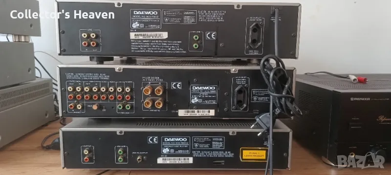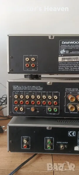Предлагам комплект оборудване daewoo acs-7000, производство 1998г. Комплектът включва усилвател daewoo acs-7000a, касетен дек daewoo acs-7000d и cd плейър daewoo acs-7000cd.Интернет отново дойде на помощ: оказа се, че корейският комплект е едно към едно с американския Sherwood, също от серия 7000. Други характеристики на Daewoo ACS-7000: - дебели стоманени корпуси, дебели алуминиеви фасади с приятен златист цвят, - дръжките и бутоните също са изработени от алуминий, — касетен дек с касета с предно зареждане, като CD плейър, с автоматично обръщане, автоматично откриване на видове ленти, луминисцентен индикатор, UWB Dolby B, C HX Pro, — стерео усилвателят няма тон блок, но захранването използва 2 мощни трансформатора, а изходните стъпала работят в чист клас “А”! — CD плейърът е оборудван с 1-bit
