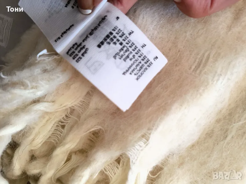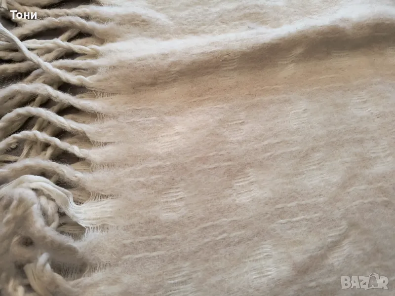 Създава усещането за уюта и топлината на одеяло. Цветът е капучино , мръсно бял , завършва по краищата с малки ресни. С палто/ яке в червената гама би стоял страхотно. Успешно съчетание е и с връхни дрехи в кафявата гама.Истинско съкровище за студените и неприветливи дни. В неговата прегръдка няма да почувствате студ. Съставът е 33 % памук , 28 % вълна , 23 % алпака , 15 % полиамид .