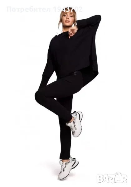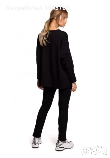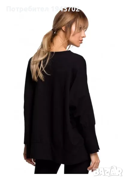 Дамски суичър с цепки отстрани в черен цвят. Моделът е със свободна кройка и кимоно ръкави, завършващи с цепки. Предната част на суичъра е по-къса от задната.