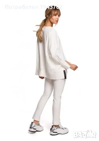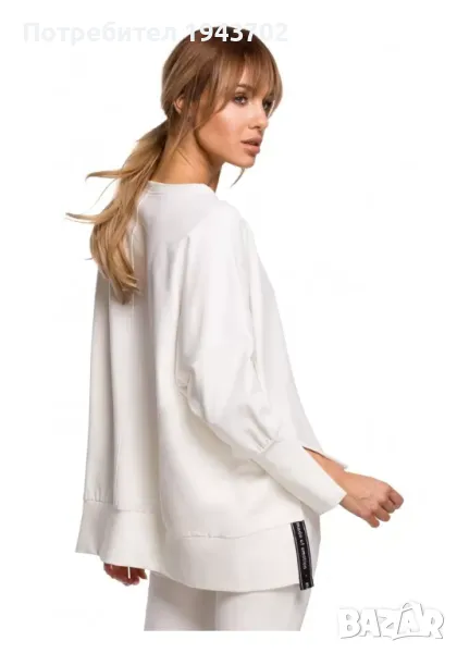 Дамски суичър с цепки отстрани в цвят екрю. Моделът е със свободна кройка и кимоно ръкави, завършващи с цепки. Предната част на суичъра е по-къса от задната.