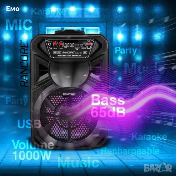 С активната тонколона Rancore X11 вие получавате не само качествен звук и мощни функции, но и пълна гъвкавост във вашето аудио изживяване. Независимо дали сте професионал или любител на музиката, тази тонколона е надежден партньор за всяка ситуация. Номинална мощност: 10W Говорител: 8 инча P.M.P.O. мощност: 1000W Батерия: 3.7V / 1800mAh. Честотна характеристика: 20Hz-20kHz Чувствителност: 65dB; Съпротивление: 3oHm Тегло: 2kg; Размери: 258x235x426mm. Активна тонколона. Презареждаща батерия. Свързване на външни звукови устройства чрез USB или TF card входове. Говорител: 8