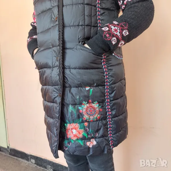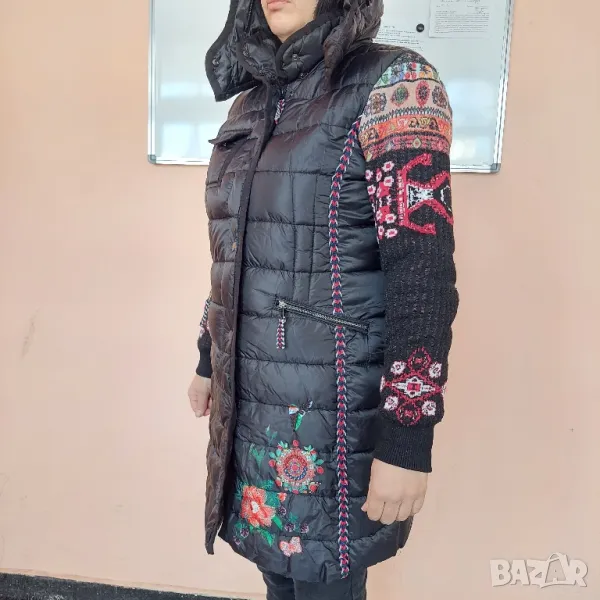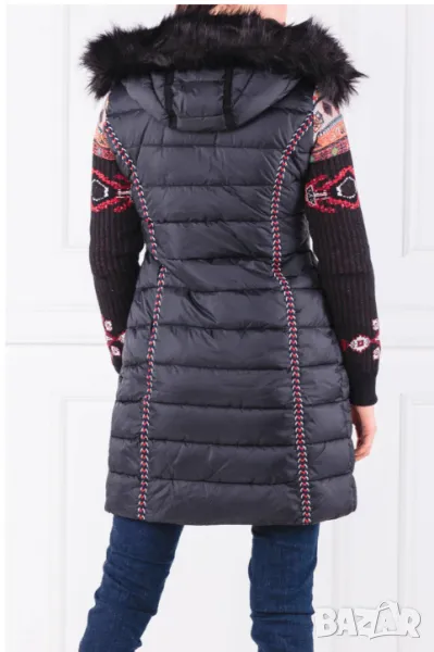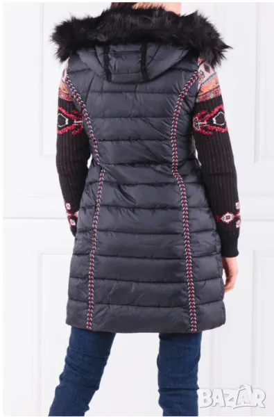 Desigual Coat "Georgia" - ефектно дълго подплатено зимно черно яке с плетени ръкави в прекрасен цветен дизайн с нишки с лурекс, закопчаване с цип, джобове с цип, качулка със свалящи се детайли от косъм, вълнен детайл, топло. Удобна, гладка кройка и ефектна визия! С подплата. Полиестер - Памук - Метализирани влакна. Стил 18WWEW64
