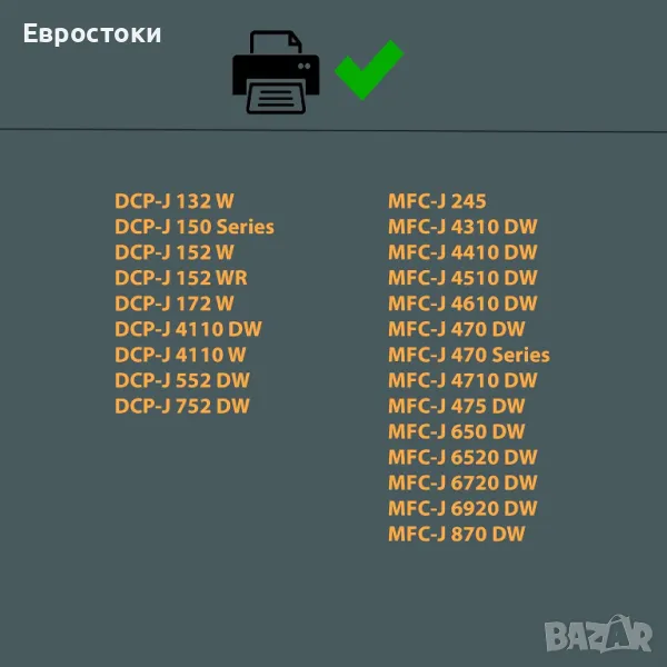 Съвместим печат: MFC-J245 / MFC-J470 Series / MFC-J470dw / MFC-J475dw / MFC-J650dw / MFC-J870dw / MFC-J4310dw / MFC-J4410dw / MFC-J4510dw / / / MFC-J4610dw / MFC-J4710dw / MFC-J6520dw / MFC-J6720dw / MFC-J6920dw / DCP-J132w / DCP-J150 Series / DCP-J152w / DCP-J152wr / DCP-J172w / DCP-J552dw / DCP-J752dw / DCP-J4111 0dw / DCP-J4110w.