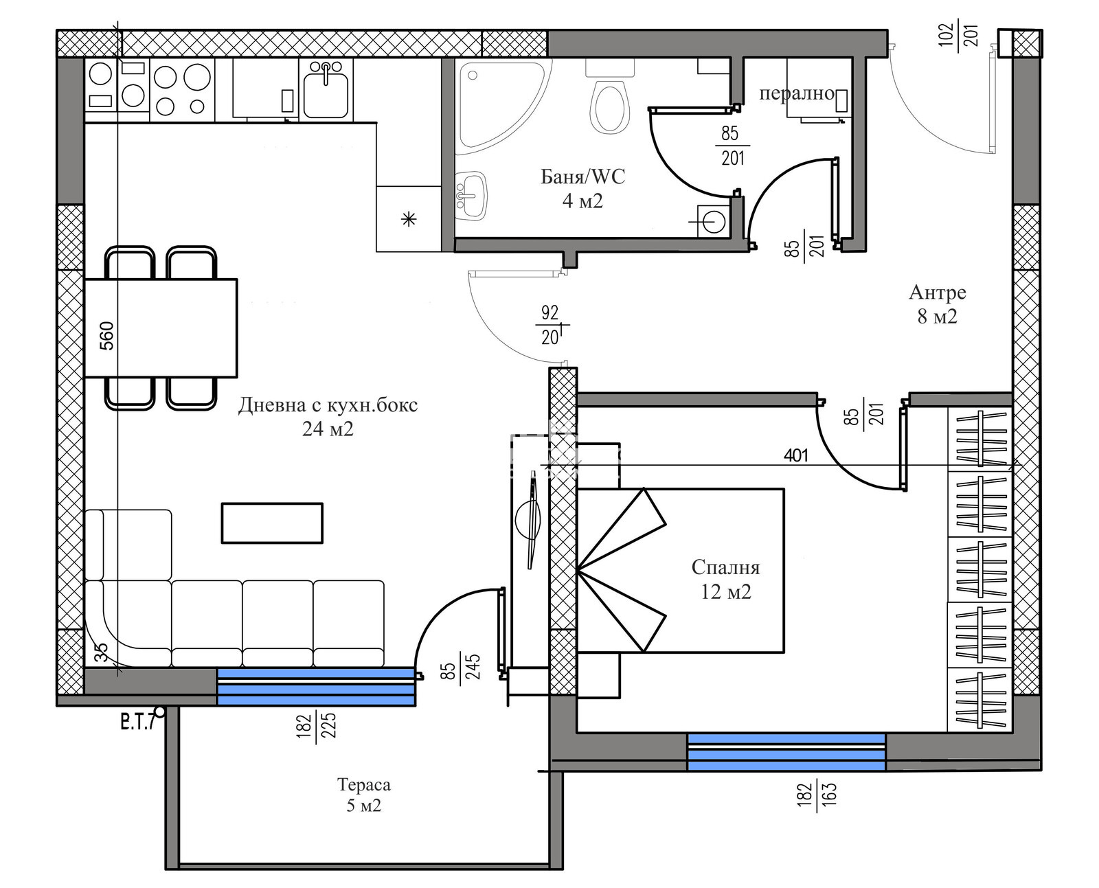 Оферта 65594: Специално предложение - Новоизградена сграда, намираща се в престижен и предпочитан район. Разпределения - Предлагаме на Вашето внимание двустаен апартамент, разположен на 2-ри жилищен етаж, състоящ се от дневна 24кв.м. с трапезария и кухненски бокс с излаз на тераса, една непреходна спалня 12кв.м., баня с тоалетна, входно антре и перално. Към апартамента има прилежаща изба.