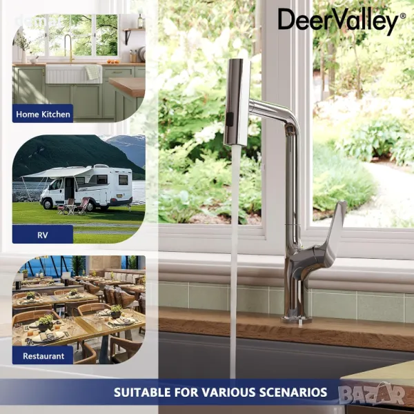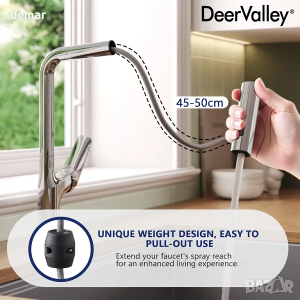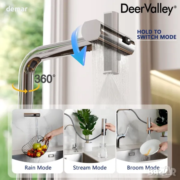 Кухненският кран DeerValley разполага с три режима на воден поток: деликатен аератор за ежедневно почистване, мощен широк спрей за трудно отстраняване на остатъци и метещ спрей за широко покритие, всички проектирани да пестят вода по време на почистване. Въртящият се на 360° чучур и прибиращият се PEX маркуч осигуряват несравнима гъвкавост, позволявайки лесен достъп до всеки ъгъл на мивката, за да се намалят пръските и да се намали времето за почистване. Интуитивното управление с една ръкохватка позволява безпроблемно регулиране на температурата и потока на водата с една ръка, подобрявайки ефективността при многозадачност. Изработен от екологично чиста неръждаема стомана SUS 304, кранът е устойчив на корозия и ръжда, гарантирайки издръжливост и надеждна работа. Всяка единица е напълно тествана преди изпращане и е налична поддръжка на клиенти за проблеми с инсталирането или използването, като се има предвид, че остатъчните водни капки от тестването са нормални.