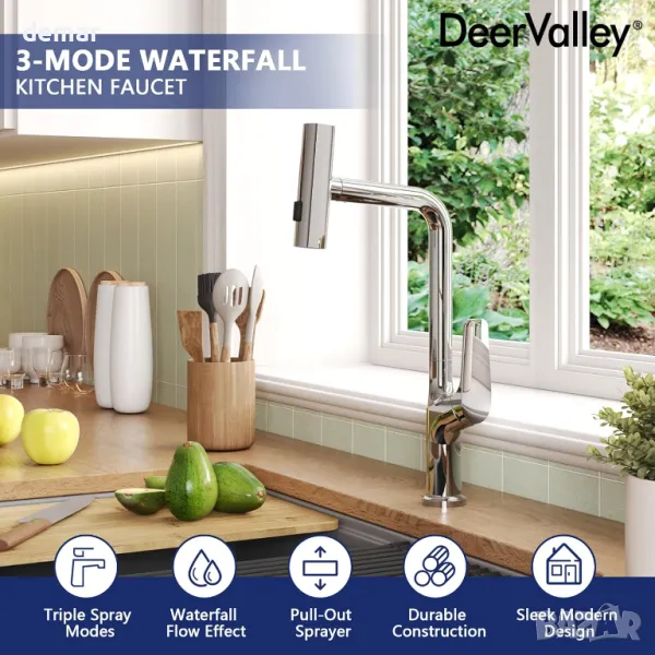 DeerValley Waterfall Кухненски кран за мивка с една дръжка и издърпваща се пръскачка с 3 режима
