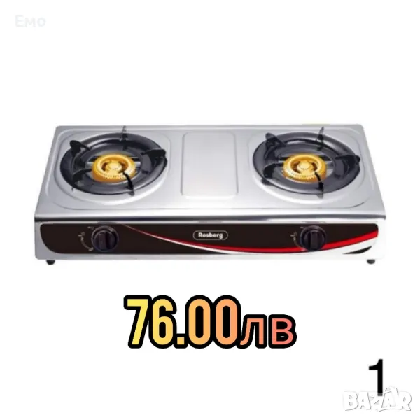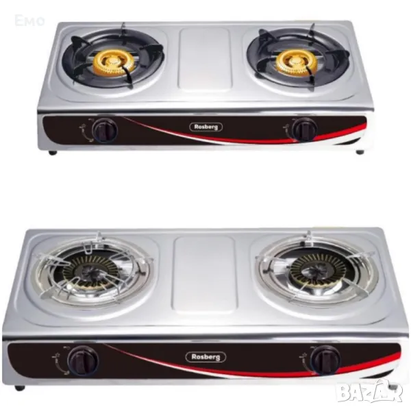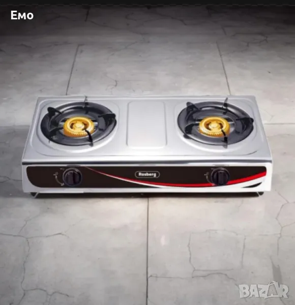 Чугунени горелки, с три поставки. Мощност: 6.9 kW (502 g/h) Налягане на газ: 30 mbar. Тип газ: Бутан, Пропан и техните смеси. Материал на панела: Неръждаема стомана. Материал на горелките: Чугунени, 2 x 120 мм. Поставки: Неръждаема за тиган, галванизирана за тенджери, допълнителна за кана за кафе. Автоматично запалване: Да. Защита при угасване на пламъка: Да.