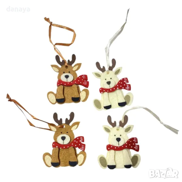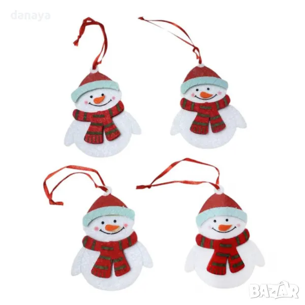 Комплект от 4 броя коледни украшения за елха или гирлянд. Коледните играчки са с форма на снежен човек или еленчета. Стоят красиво и създават коледно настроение, където и да ги закачиш.