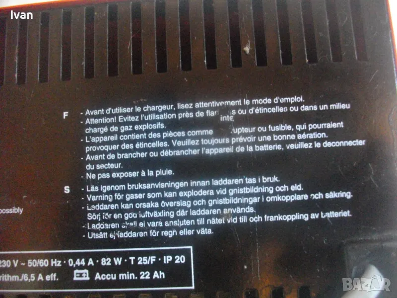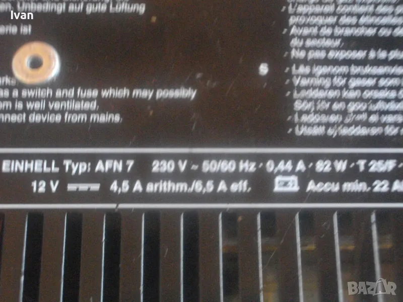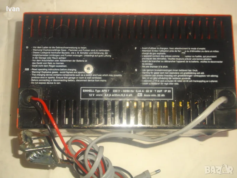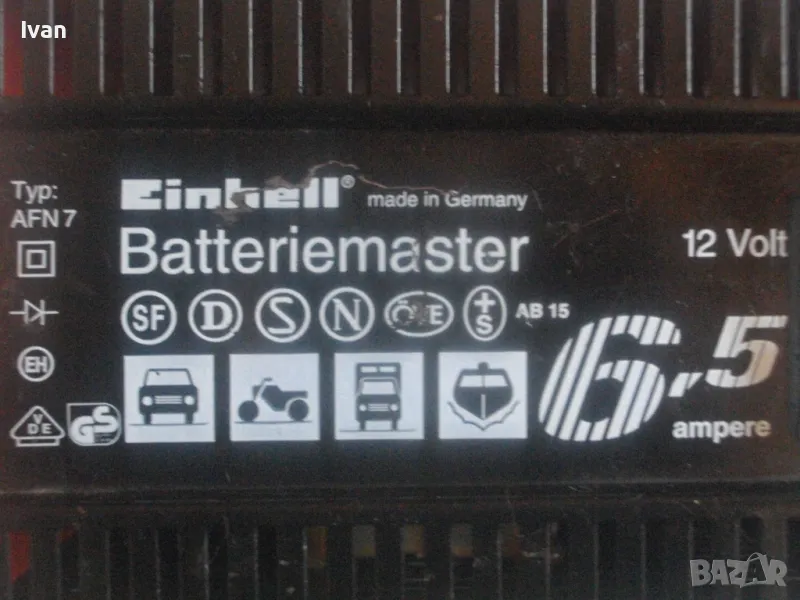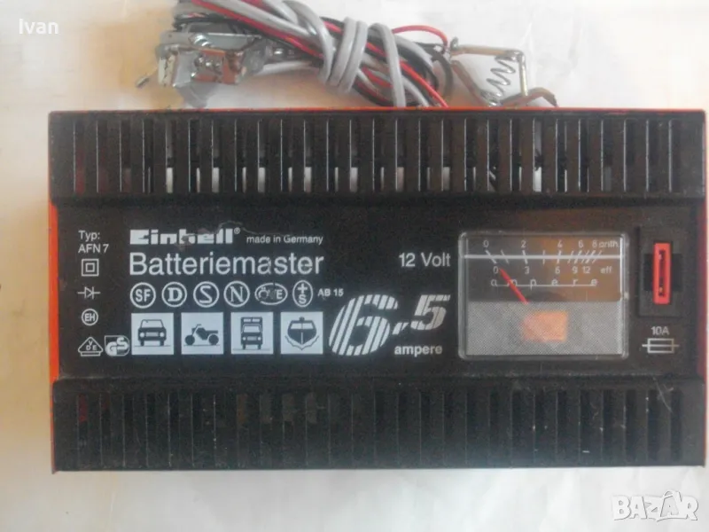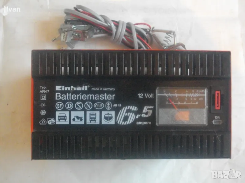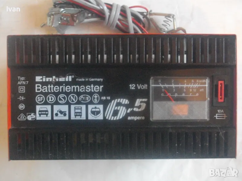 ОПИСАНИЕ на ел. 12 волтово зарядно - цена 129 лв. За акумулатори 12 волта. Старо немско оригинално качество, маркирано. Почти ново зарядно, в отлично работно и електрическо състояние. Марка и модел Einhell Betteriemaster Typ AFN 7. За 12 Volt зареждане, Мощност на уреда 6,5 Ampere ампера, бушон защита 10 ампера. Метална масивна кутия с размери 200 х 155 х 110 мм, оригинален захранващ кабел, оригинални кабели с щипки за клемите. Тегло на уреда 2,0 кг.