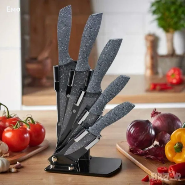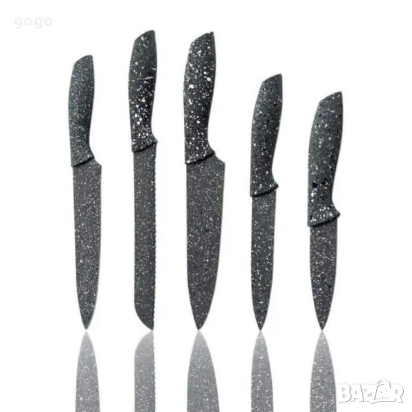 Остриета от висококачествени стомана с мраморно незалепващо покритие. Лесно почистване чрез измиване или избърсване с кърпа. Специални ергономични дръжки за удобство и добър контрол при работа. Измийте добре преди първоначална употреба. Комплектът включва : 8” Готварски уред; 8” уред за хляб; 6Готварски уред 5” Универсален уред 3.5” уред за белене.