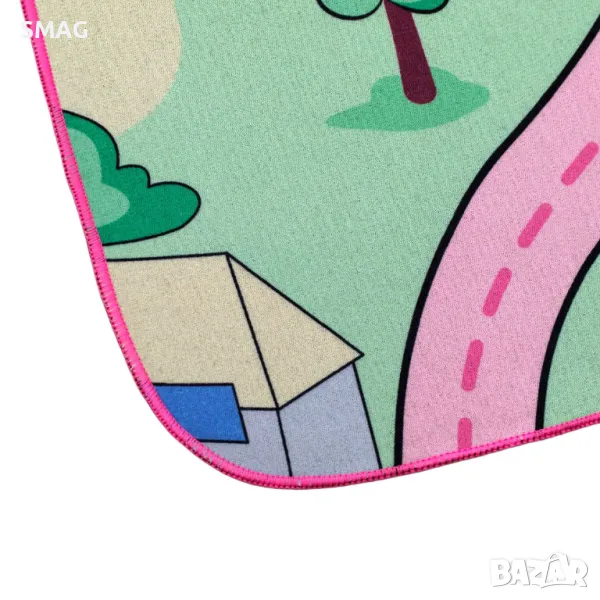 Декоративен правоъгълен килим, розов с шарка на селски път и противоплъзгаща повърхност на дъното.