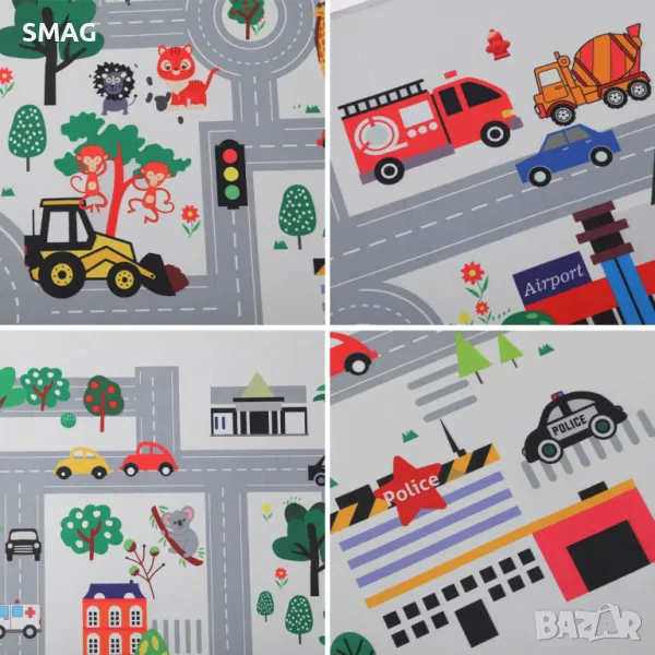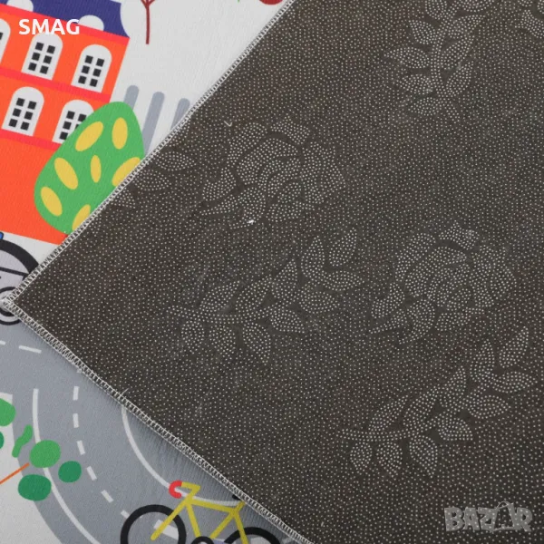 Декоративна правоъгълна постелка, сива с магистрален дизайн и противоплъзгаща повърхност на дъното.