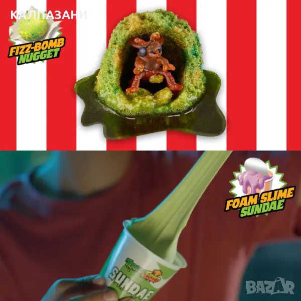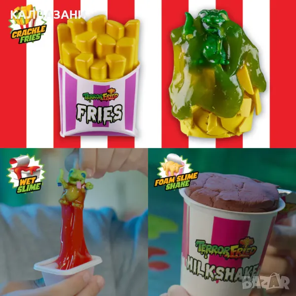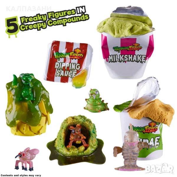 Terror Fried Бокс менюто идва с 6 части и включва всички твои любими храни от заведения за бързо хранене с ужасяващ привкус. Хапките и бургерът се „пържат“ във вода, за да разкрият странна гадна фигурка. Скърши пържените картофки и смачкай чашата за слъши за още ужасяващи изненади. Включва също два соса, един от които вонящ, и 5 фигурки, скрити в храната.