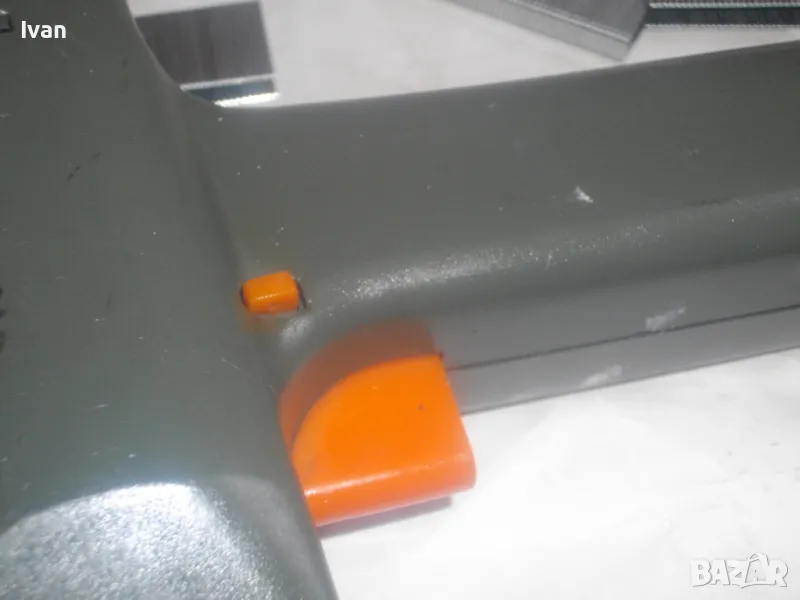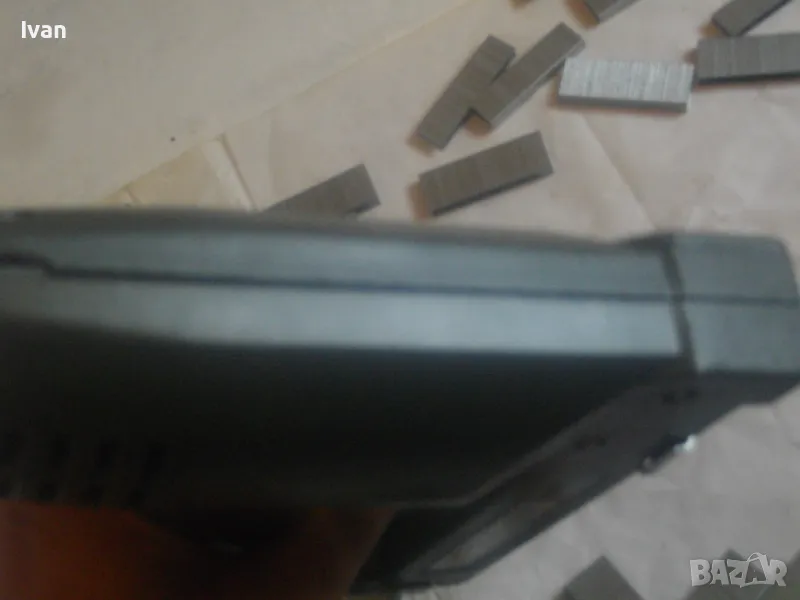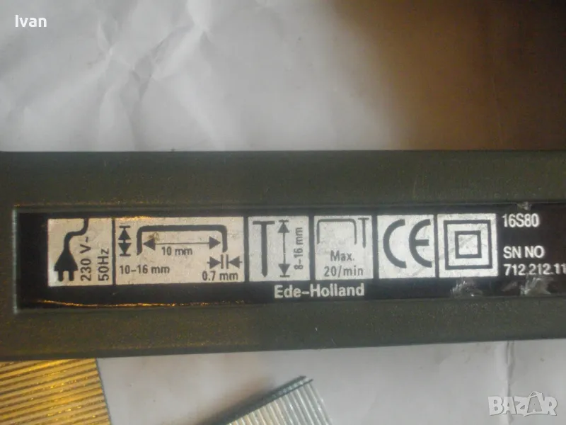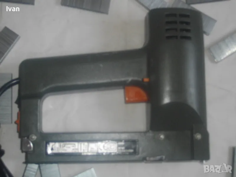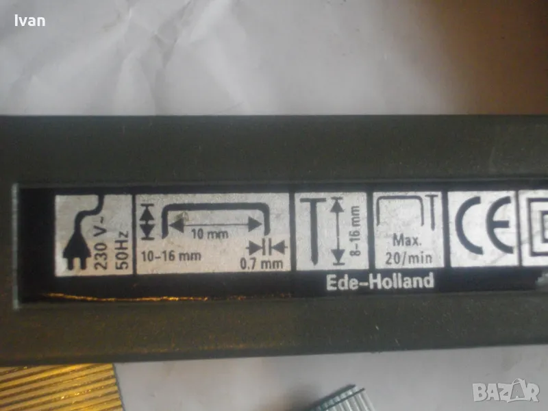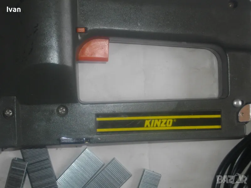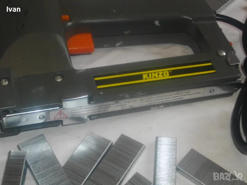 Такер сив цвят електрически комбиниран KINZO. Оригинален професионален холандски нидерландски 2001 г. Марката е професионална. Производител Ede-HOLAND. Тип тапицерски дърводелски комбиниран за скоби размер 10-16 мм дължина и пирони размер дължина 8-16 мм. Макс брой удари в мин - 20. Заключване защита на спусъка. Бутон включване и ключ заключване на пълнителя. Размери 195 х 160 х 50 мм. Тегло - 1,0 кг. Заредени в пълнителя блистер скоби за проба и тест.