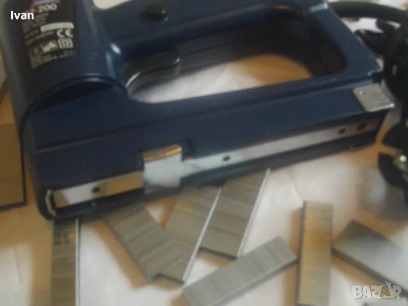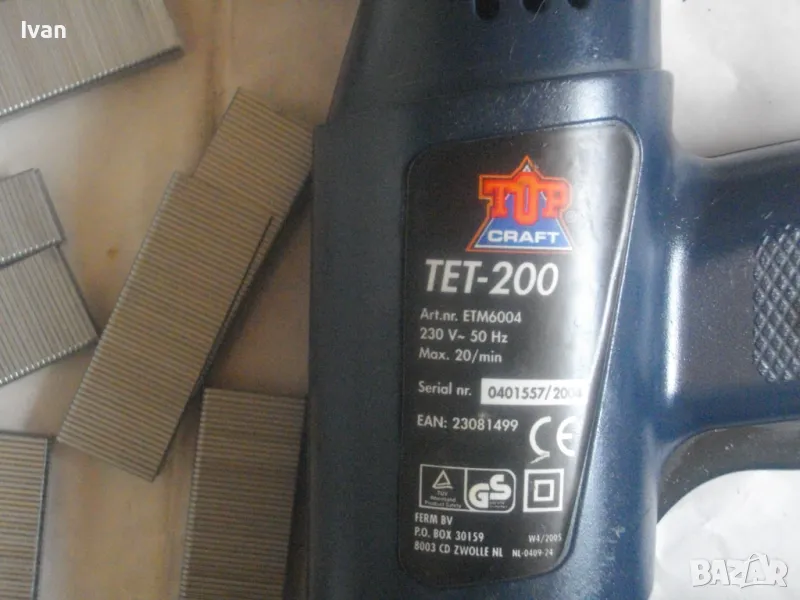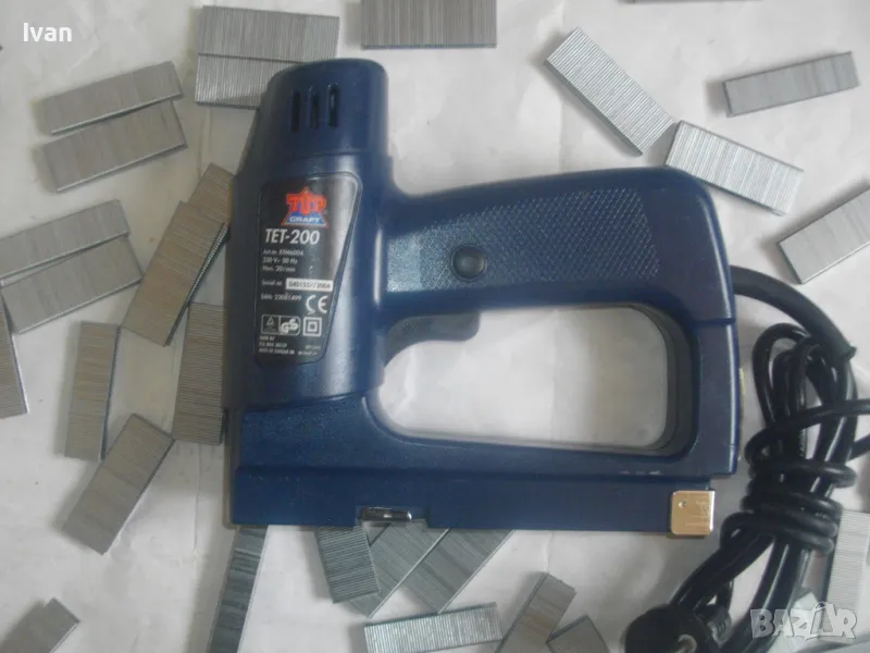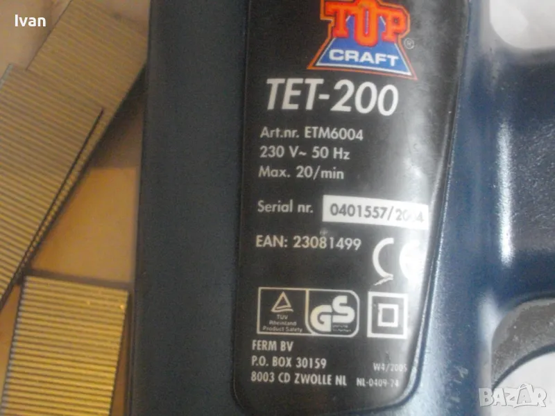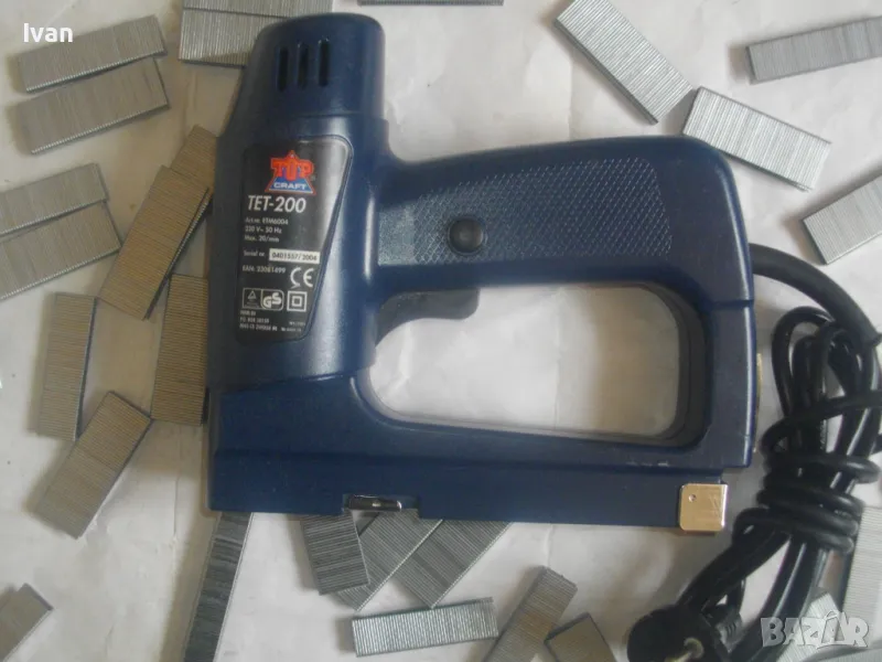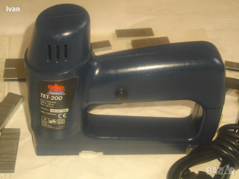Такер тъмносин електрически TOP CRAFT TET 200. Холандски нидерландски оригинален, вписано на фабричния стикер. Производител маркиран FERM B.V. 2005 г. Комбиниран - за скоби 6-14 мм и пирони 14 мм и игли размер 14 мм. Като нов, много запазен външен вид, без драскотина и в отлично работно състояние. Без забележки. Масивен корпус от твърда пластмаса с релефна, нехлъзгаща се дръжка. Размери 180 х 200 х 50 мм. Автозащита на спусъка. Заредени скоби в пълнитееля за проба и тест. Тегло - 1,0 кг.